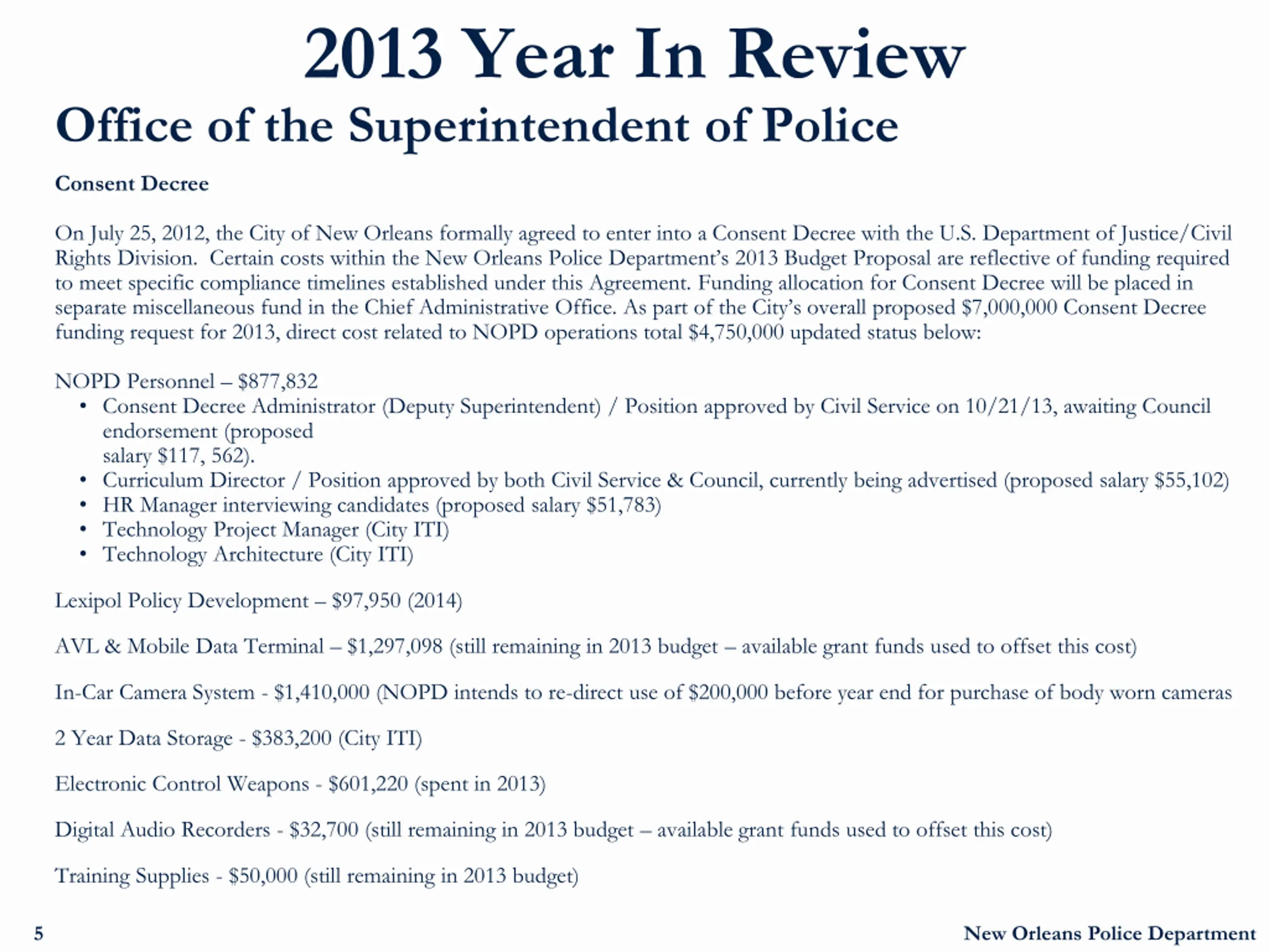 2013 Year In Review Office of the Superintendent of Police Consent Decree On July 25, 2012, the City of New Orleans formally agreed to enter into a Consent Decree with the U.S. Department of Justice/Civil Rights Division. Certain costs within the New Orleans Police Department s 2013 Budget Proposal are reflective of funding required to meet specific compliance timelines established under this Agreement. Funding allocation for Consent Decree will be placed in separate miscellaneous fund in the Chief Administrative Office. As part of the City s overall proposed $7,000,000 Consent Decree funding request for 2013, direct cost related to NOPD operations total $4,750,000 updated status below: NOPD Personnel $877,832 Consent Decree Administrator (Deputy Superintendent) / Position approved by Civil Service on 10/21/13, awaiting Council endorsement (proposed salary $117, 562). Curriculum Director / Position approved by both Civil Service & Council, currently being advertised (proposed salary $55,102) HR Manager interviewing candidates (proposed salary $51,783) Technology Project Manager (City ITI) Technology Architecture (City ITI) Lexipol Policy Development $97,950 (2014) AVL & Mobile Data Terminal $1,297,098 (still remaining in 2013 budget available grant funds used to offset this cost) In-Car Camera System - $1,410,000 (NOPD intends to re-direct use of $200,000 before year end for purchase of body worn cameras 2 Year Data Storage - $383,200 (City ITI) Electronic Control Weapons - $601,220 (spent in 2013) Digital Audio Recorders - $32,700 (still remaining in 2013 budget available grant funds used to offset this cost) Training Supplies - $50,000 (still remaining in 2013 budget) 5 New Orleans Police Department