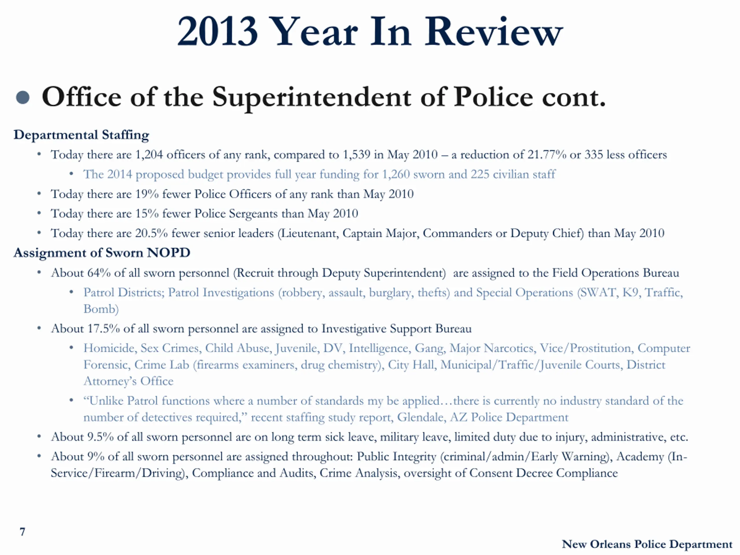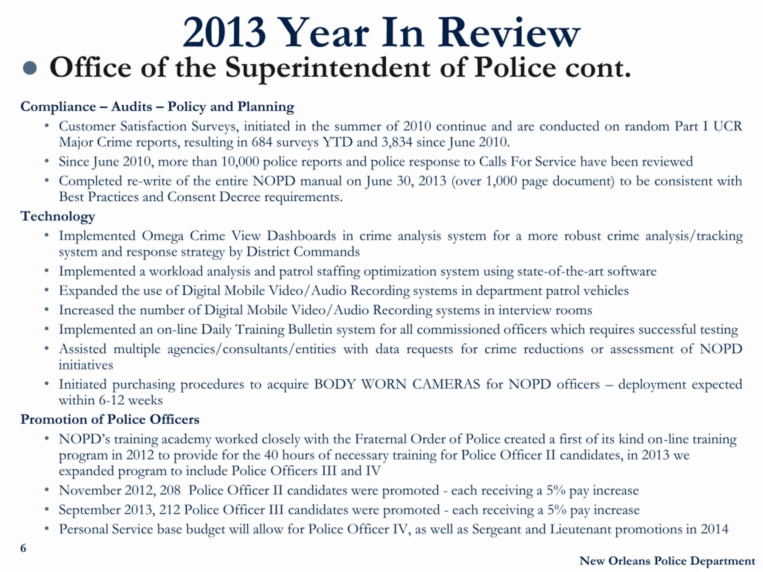 2013 Year In Review Office of the Superintendent of Police cont. Compliance Audits Policy and Planning Customer Satisfaction Surveys, initiated in the summer of 2010 continue and are conducted on random Part I UCR Major Crime reports, resulting in 684 surveys YTD and 3,834 since June 2010. Since June 2010, more than 10,000 police reports and police response to Calls For Service have been reviewed Completed re-write of the entire NOPD manual on June 30, 2013 (over 1,000 page document) to be consistent with Best Practices and Consent Decree requirements. Technology Implemented Omega Crime View Dashboards in crime analysis system for a more robust crime analysis/tracking system and response strategy by District Commands Implemented a workload analysis and patrol staffing optimization system using state-of-the-art software Expanded the use of Digital Mobile Video/Audio Recording systems in department patrol vehicles Increased the number of Digital Mobile Video/Audio Recording systems in interview rooms Implemented an on-line Daily Training Bulletin system for all commissioned officers which requires successful testing Assisted multiple agencies/consultants/entities with data requests for crime reductions or assessment of NOPD initiatives Initiated purchasing procedures to acquire BODY WORN CAMERAS for NOPD officers deployment expected within 6-12 weeks Promotion of Police Officers NOPD s training academy worked closely with the Fraternal Order of Police created a first of its kind on-line training program in 2012 to provide for the 40 hours of necessary training for Police Officer II candidates, in 2013 we expanded program to include Police Officers III and IV November 2012, 208 Police Officer II candidates were promoted - each receiving a 5% pay increase September 2013, 212 Police Officer III candidates were promoted - each receiving a 5% pay increase Personal Service base budget will allow for Police Officer IV, as well as Sergeant and Lieutenant promotions in 2014 6 New Orleans Police Department