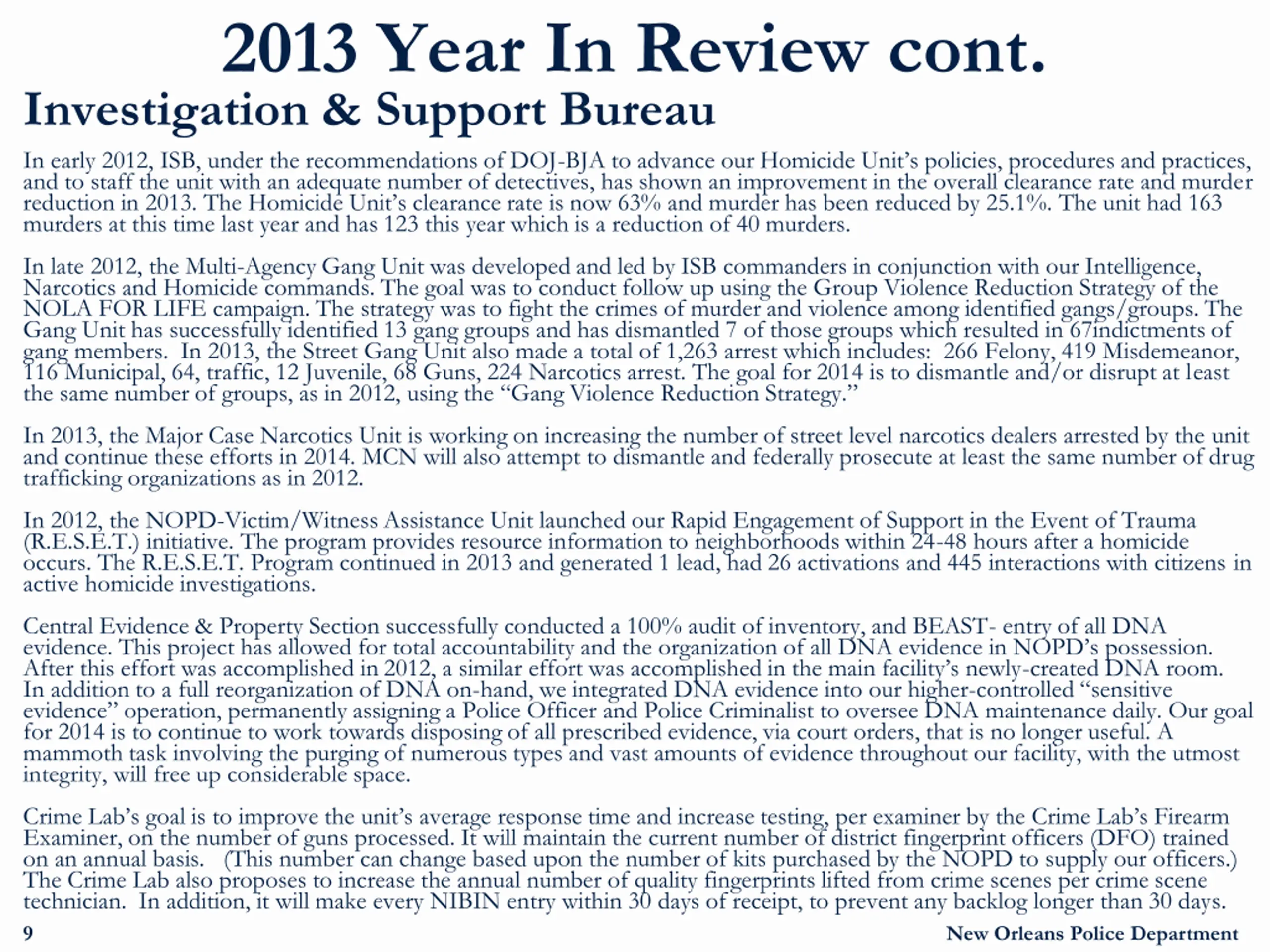 2013 Year In Review cont. Investigation & Support Bureau In early 2012, ISB, under the recommendations of DOJ-BJA to advance our Homicide Unit s policies, procedures and practices, and to staff the unit with an adequate number of detectives, has shown an improvement in the overall clearance rate and murder reduction in 2013. The Homicide Unit s clearance rate is now 63% and murder has been reduced by 25.1%. The unit had 163 murders at this time last year and has 123 this year which is a reduction of 40 murders. In late 2012, the Multi-Agency Gang Unit was developed and led by ISB commanders in conjunction with our Intelligence, Narcotics and Homicide commands. The goal was to conduct follow up using the Group Violence Reduction Strategy of the NOLA FOR LIFE campaign. The strategy was to fight the crimes of murder and violence among identified gangs/groups. The Gang Unit has successfully identified 13 gang groups and has dismantled 7 of those groups which resulted in 67indictments of gang members. In 2013, the Street Gang Unit also made a total of 1,263 arrest which includes: 266 Felony, 419 Misdemeanor, 116 Municipal, 64, traffic, 12 Juvenile, 68 Guns, 224 Narcotics arrest. The goal for 2014 is to dismantle and/or disrupt at least the same number of groups, as in 2012, using the Gang Violence Reduction Strategy. In 2013, the Major Case Narcotics Unit is working on increasing the number of street level narcotics dealers arrested by the unit and continue these efforts in 2014. MCN will also attempt to dismantle and federally prosecute at least the same number of drug trafficking organizations as in 2012. In 2012, the NOPD-Victim/Witness Assistance Unit launched our Rapid Engagement of Support in the Event of Trauma (R.E.S.E.T.) initiative. The program provides resource information to neighborhoods within 24-48 hours after a homicide occurs. The R.E.S.E.T. Program continued in 2013 and generated 1 lead, had 26 activations and 445 interactions with citizens in active homicide investigations. Central Evidence & Property Section successfully conducted a 100% audit of inventory, and BEAST- entry of all DNA evidence. This project has allowed for total accountability and the organization of all DNA evidence in NOPD s possession. After this effort was accomplished in 2012, a similar effort was accomplished in the main facility s newly-created DNA room. In addition to a full reorganization of DNA on-hand, we integrated DNA evidence into our higher-controlled sensitive evidence operation, permanently assigning a Police Officer and Police Criminalist to oversee DNA maintenance daily. Our goal for 2014 is to continue to work towards disposing of all prescribed evidence, via court orders, that is no longer useful. A mammoth task involving the purging of numerous types and vast amounts of evidence throughout our facility, with the utmost integrity, will free up considerable space. Crime Lab s goal is to improve the unit s average response time and increase testing, per examiner by the Crime Lab s Firearm Examiner, on the number of guns processed. It will maintain the current number of district fingerprint officers (DFO) trained on an annual basis. (This number can change based upon the number of kits purchased by the NOPD to supply our officers.) The Crime Lab also proposes to increase the annual number of quality fingerprints lifted from crime scenes per crime scene technician. In addition, it will make every NIBIN entry within 30 days of receipt, to prevent any backlog longer than 30 days. 9 New Orleans Police Department