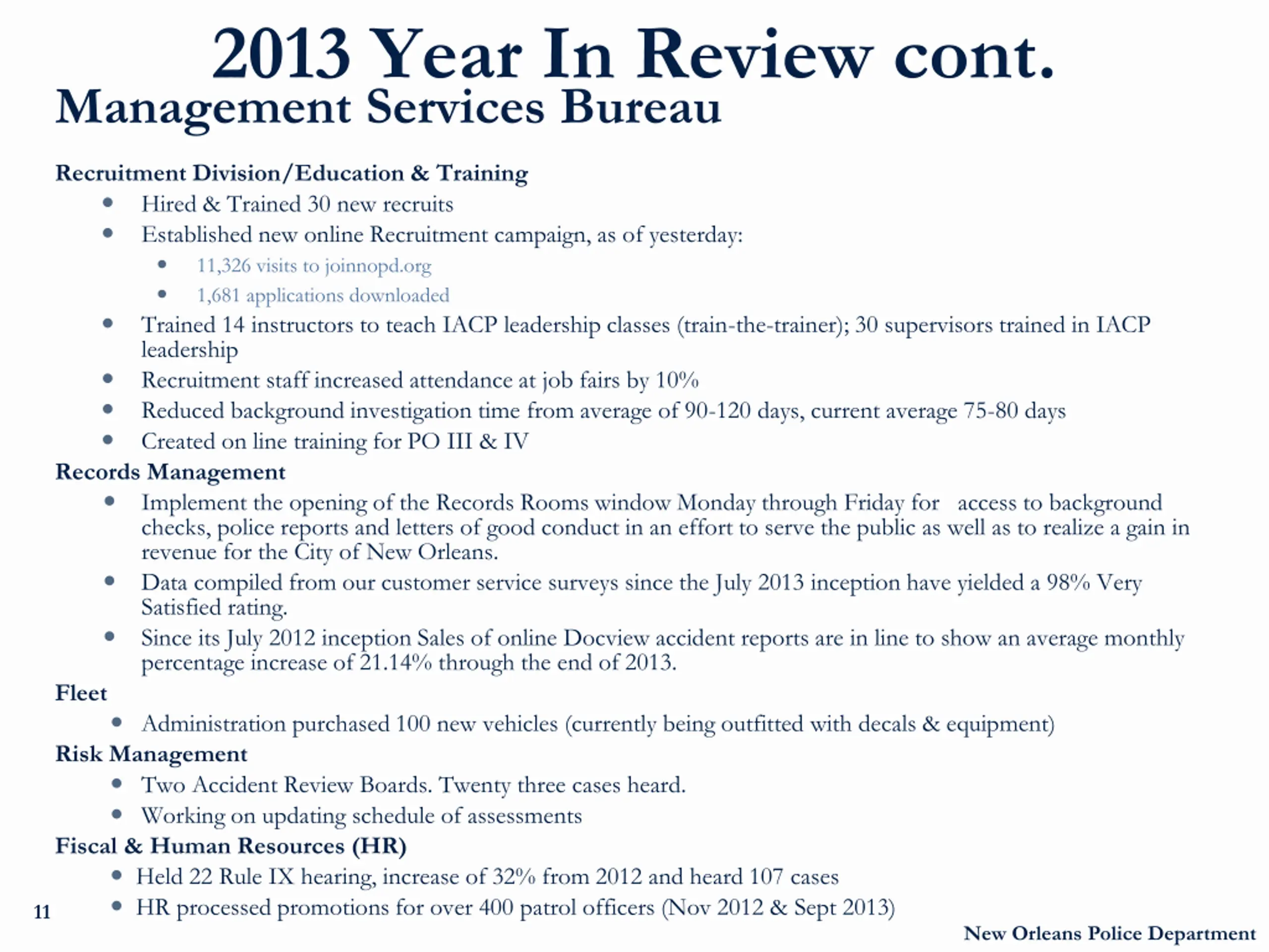 2013 Year In Review cont. Management Services Bureau Recruitment Division/Education & Training Hired & Trained 30 new recruits Established new online Recruitment campaign, as of yesterday: 11,326 visits to joinnopd.org 1,681 applications downloaded Trained 14 instructors to teach IACP leadership classes (train-the-trainer); 30 supervisors trained in IACP leadership Recruitment staff increased attendance at job fairs by 10% Reduced background investigation time from average of 90-120 days, current average 75-80 days Created on line training for PO III & IV Records Management Implement the opening of the Records Rooms window Monday through Friday for access to background checks, police reports and letters of good conduct in an effort to serve the public as well as to realize a gain in revenue for the City of New Orleans. Data compiled from our customer service surveys since the July 2013 inception have yielded a 98% Very Satisfied rating. Since its July 2012 inception Sales of online Docview accident reports are in line to show an average monthly percentage increase of 21.14% through the end of 2013. Fleet Administration purchased 100 new vehicles (currently being outfitted with decals & equipment) Risk Management Two Accident Review Boards. Twenty three cases heard. Working on updating schedule of assessments Fiscal & Human Resources (HR) Held 22 Rule IX hearing, increase of 32% from 2012 and heard 107 cases HR processed promotions for over 400 patrol officers (Nov 2012 & Sept 2013) 11 New Orleans Police Department