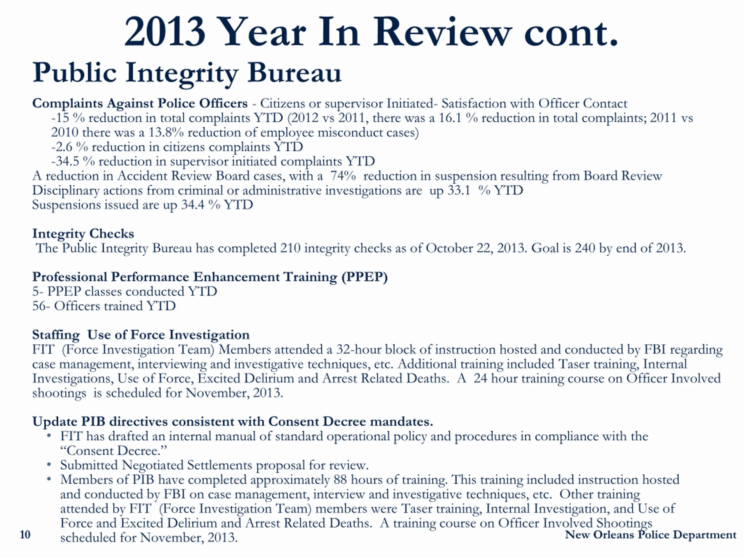 2013 Year In Review cont. Public Integrity Bureau Complaints Against Police Officers - Citizens or supervisor Initiated- Satisfaction with Officer Contact -15 % reduction in total complaints YTD (2012 vs 2011, there was a 16.1 % reduction in total complaints; 2011 vs 2010 there was a 13.8% reduction of employee misconduct cases) -2.6 % reduction in citizens complaints YTD -34.5 % reduction in supervisor initiated complaints YTD A reduction in Accident Review Board cases, with a 74% reduction in suspension resulting from Board Review Disciplinary actions from criminal or administrative investigations are up 33.1 % YTD Suspensions issued are up 34.4 % YTD Integrity Checks The Public Integrity Bureau has completed 210 integrity checks as of October 22, 2013. Goal is 240 by end of 2013. Professional Performance Enhancement Training (PPEP) 5- PPEP classes conducted YTD 56- Officers trained YTD Staffing Use of Force Investigation FIT (Force Investigation Team) Members attended a 32-hour block of instruction hosted and conducted by FBI regarding case management, interviewing and investigative techniques, etc. Additional training included Taser training, Internal Investigations, Use of Force, Excited Delirium and Arrest Related Deaths. A 24 hour training course on Officer Involved shootings is scheduled for November, 2013. Update PIB directives consistent with Consent Decree mandates. FIT has drafted an internal manual of standard operational policy and procedures in compliance with the Consent Decree. Submitted Negotiated Settlements proposal for review. Members of PIB have completed approximately 88 hours of training. This training included instruction hosted and conducted by FBI on case management, interview and investigative techniques, etc. Other training attended by FIT (Force Investigation Team) members were Taser training, Internal Investigation, and Use of Force and Excited Delirium and Arrest Related Deaths. A training course on Officer Involved Shootings scheduled for November, 2013. 10 New Orleans Police Department