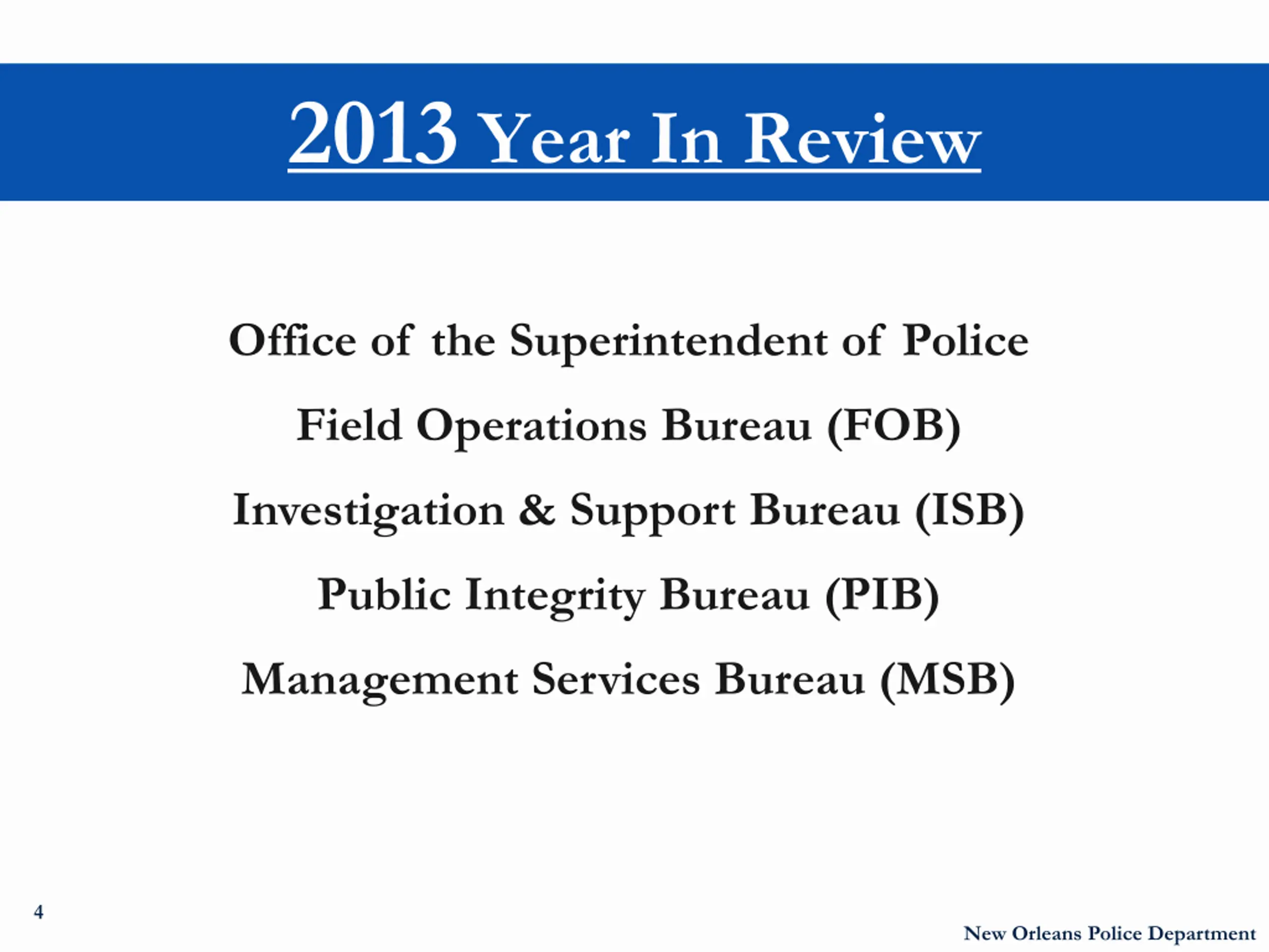 2013 Year In Review Office of the Superintendent of Police Field Operations Bureau (FOB) Investigation & Support Bureau (ISB) Public Integrity Bureau (PIB) Management Services Bureau (MSB) 4 New Orleans Police Department