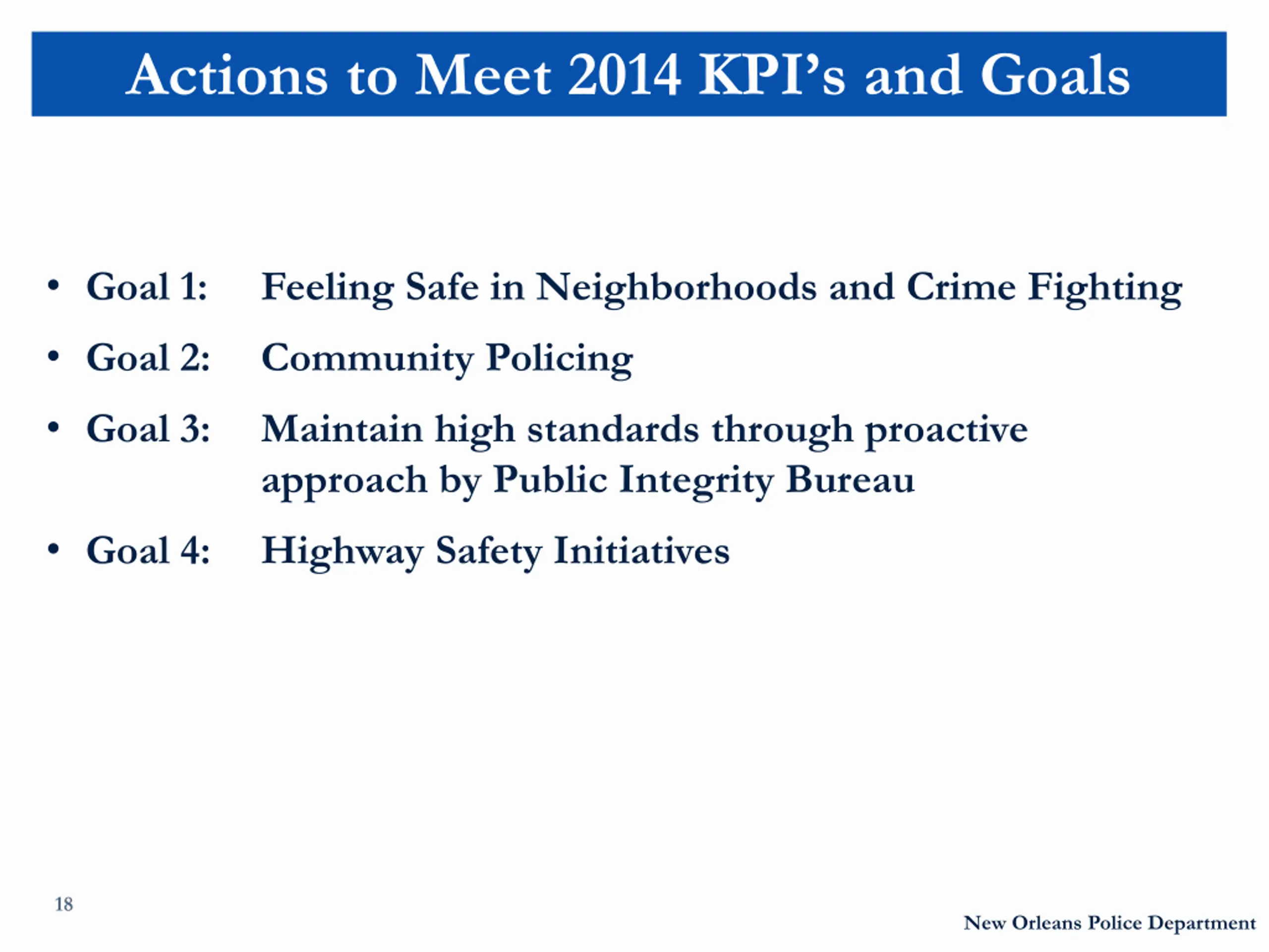 Actions to Meet 2014 KPIs and Goals Goal 1: Feeling Safe in Neighborhoods and Crime Fighting Goal 2: Community Policing Goal 3: Maintain high standards through proactive approach by Public Integrity Bureau Goal 4: Highway Safety Initiatives 18 New Orleans Police Department