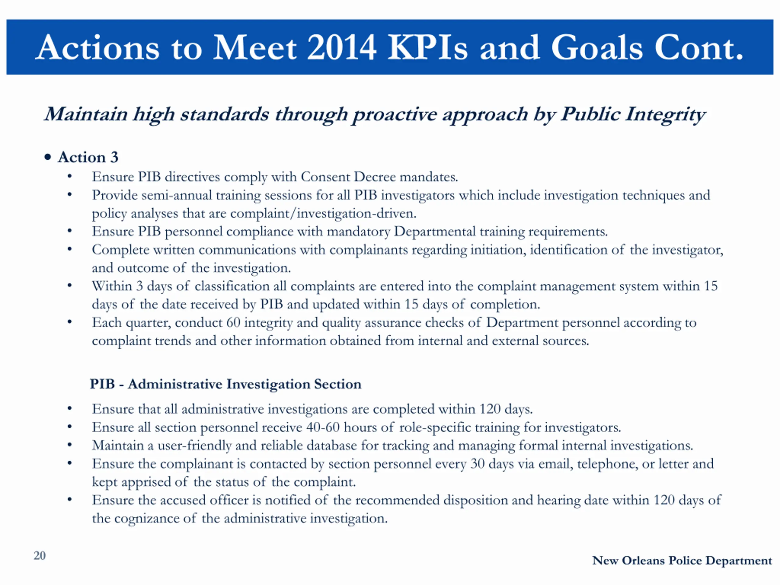 Actions to Meet 2014 KPIs and Goals Cont. Maintain high standards through proactive approach by Public Integrity Action 3 Ensure PIB directives comply with Consent Decree mandates. Provide semi-annual training sessions for all PIB investigators which include investigation techniques and policy analyses that are complaint/investigation-driven. Ensure PIB personnel compliance with mandatory Departmental training requirements. Complete written communications with complainants regarding initiation, identification of the investigator, and outcome of the investigation. Within 3 days of classification all complaints are entered into the complaint management system within 15 days of the date received by PIB and updated within 15 days of completion. Each quarter, conduct 60 integrity and quality assurance checks of Department personnel according to complaint trends and other information obtained from internal and external sources. PIB - Administrative Investigation Section Ensure that all administrative investigations are completed within 120 days. Ensure all section personnel receive 40-60 hours of role-specific training for investigators. Maintain a user-friendly and reliable database for tracking and managing formal internal investigations. Ensure the complainant is contacted by section personnel every 30 days via email, telephone, or letter and kept apprised of the status of the complaint. Ensure the accused officer is notified of the recommended disposition and hearing date within 120 days of the cognizance of the administrative investigation. 20 New Orleans Police Department