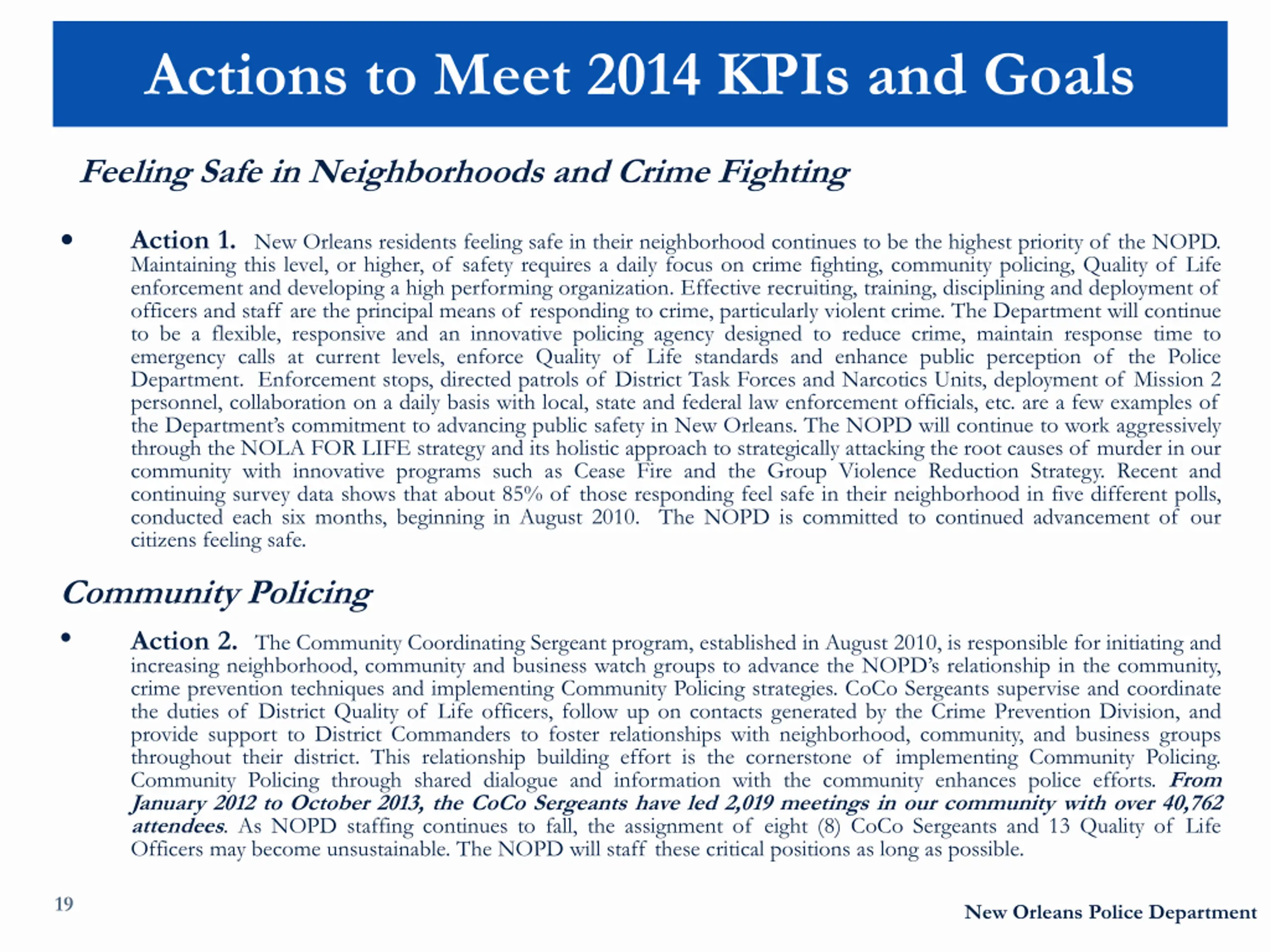 Actions to Meet 2014 KPIs and Goals Feeling Safe in Neighborhoods and Crime Fighting Action 1. New Orleans residents feeling safe in their neighborhood continues to be the highest priority of the NOPD. Maintaining this level, or higher, of safety requires a daily focus on crime fighting, community policing, Quality of Life enforcement and developing a high performing organization. Effective recruiting, training, disciplining and deployment of officers and staff are the principal means of responding to crime, particularly violent crime. The Department will continue to be a flexible, responsive and an innovative policing agency designed to reduce crime, maintain response time to emergency calls at current levels, enforce Quality of Life standards and enhance public perception of the Police Department. Enforcement stops, directed patrols of District Task Forces and Narcotics Units, deployment of Mission 2 personnel, collaboration on a daily basis with local, state and federal law enforcement officials, etc. are a few examples of the Department s commitment to advancing public safety in New Orleans. The NOPD will continue to work aggressively through the NOLA FOR LIFE strategy and its holistic approach to strategically attacking the root causes of murder in our community with innovative programs such as Cease Fire and the Group Violence Reduction Strategy. Recent and continuing survey data shows that about 85% of those responding feel safe in their neighborhood in five different polls, conducted each six months, beginning in August 2010. The NOPD is committed to continued advancement of our citizens feeling safe. Community Policing Action 2.The Community Coordinating Sergeant program, established in August 2010, is responsible for initiating and increasing neighborhood, community and business watch groups to advance the NOPD s relationship in the community, crime prevention techniques and implementing Community Policing strategies. CoCo Sergeants supervise and coordinate the duties of District Quality of Life officers, follow up on contacts generated by the Crime Prevention Division, and provide support to District Commanders to foster relationships with neighborhood, community, and business groups throughout their district. This relationship building effort is the cornerstone of implementing Community Policing. Community Policing through shared dialogue and information with the community enhances police efforts. From January 2012 to October 2013, the CoCo Sergeants have led 2,019 meetings in our community with over 40,762 attendees. As NOPD staffing continues to fall, the assignment of eight (8) CoCo Sergeants and 13 Quality of Life Officers may become unsustainable. The NOPD will staff these critical positions as long as possible. 19 New Orleans Police Department