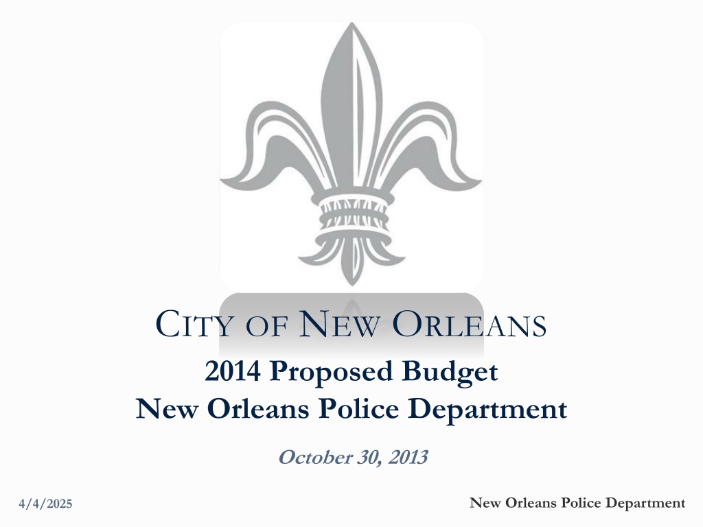 CITY OF NEW ORLEANS 2014 Proposed Budget New Orleans Police Department October 30, 2013 New Orleans Police Department 4/4/2025