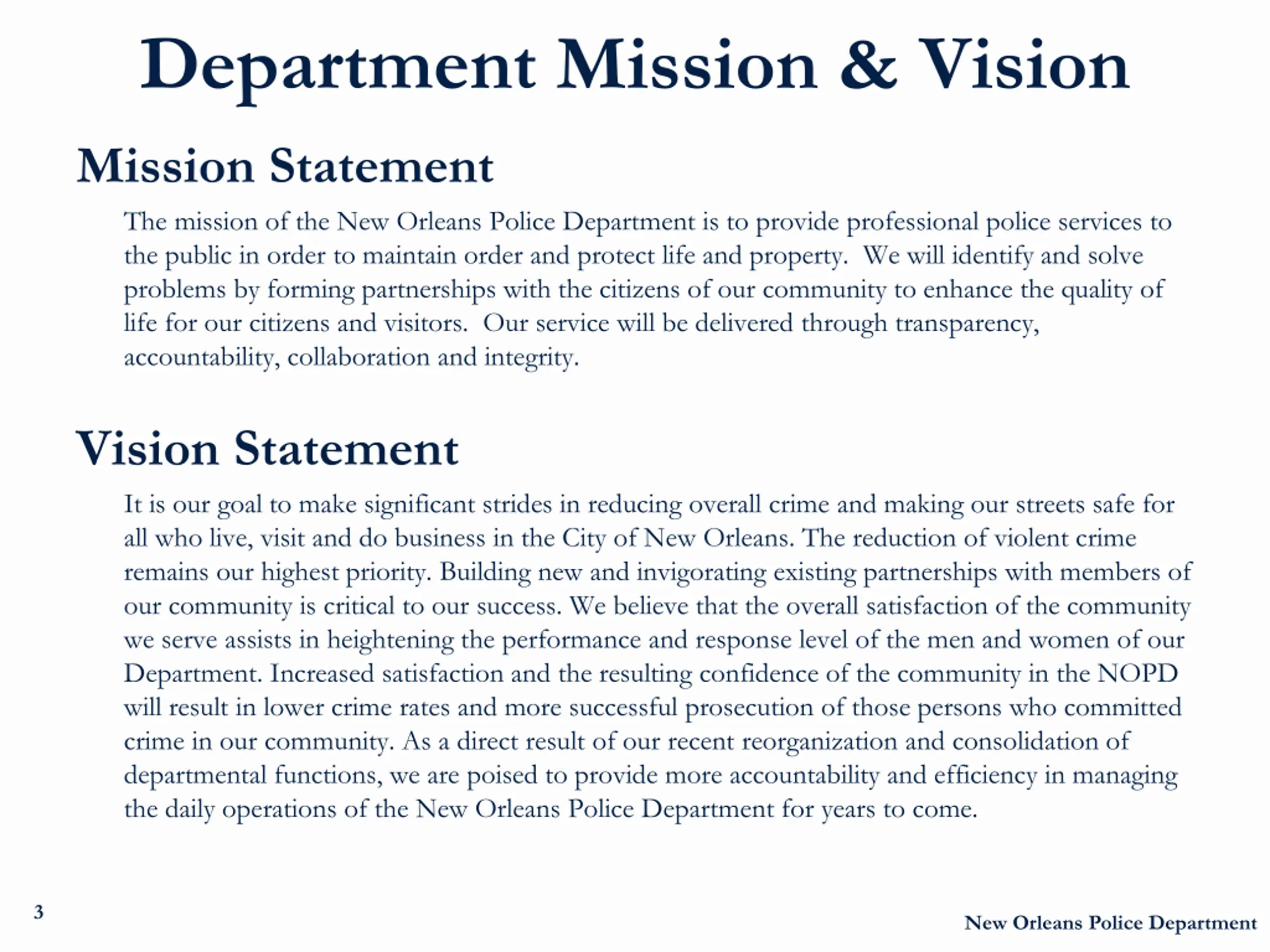 2014 Budget Presentation Department Mission & Vision 2013 Year In Review 2014 Allocation 2014 Department Goals Performance Measures 2 New Orleans Police Department