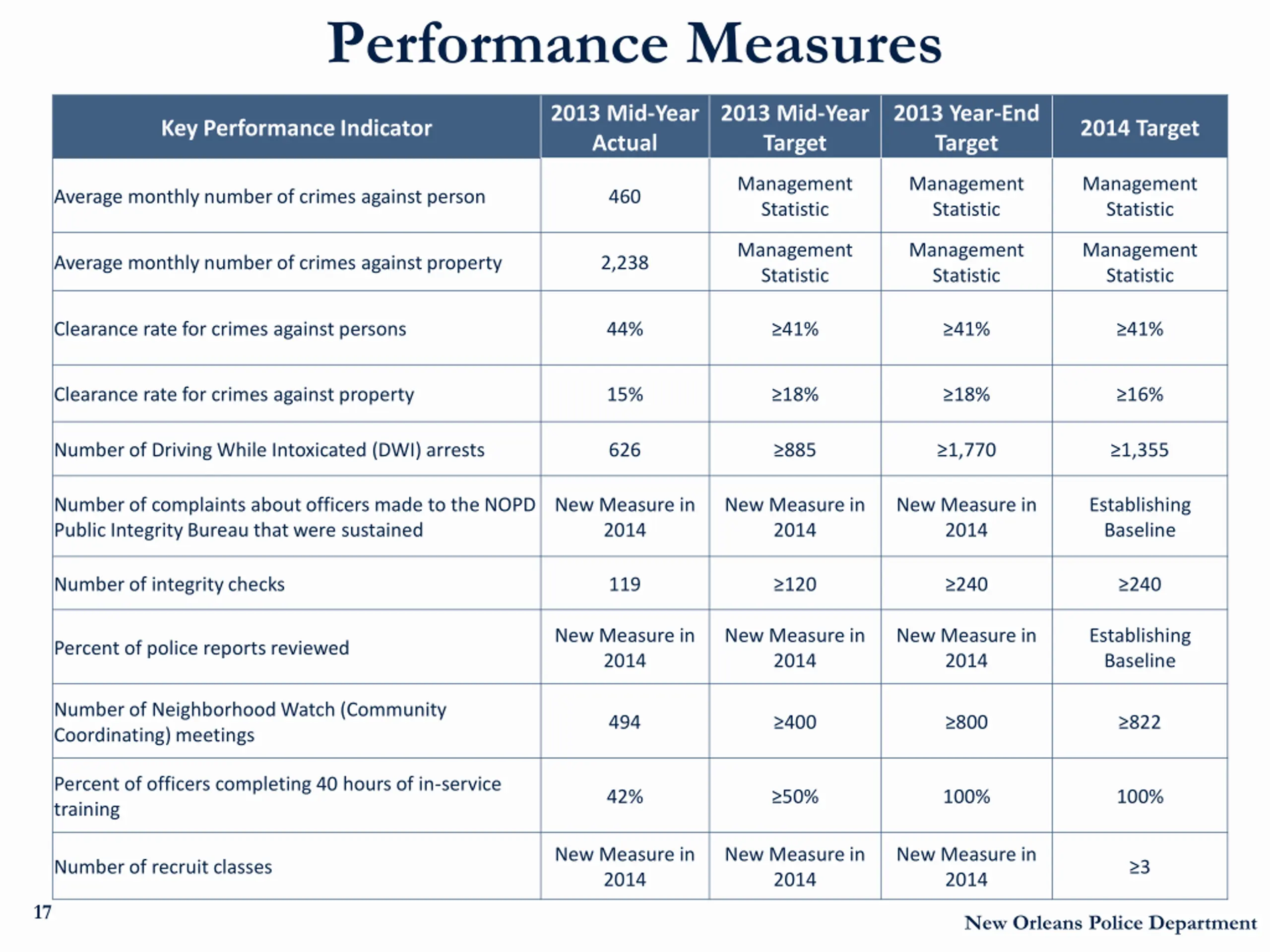 Performance Measures 2013 Mid-Year Actual 2013 Mid-Year Target 2013 Year-End Target Key Performance Indicator 2014 Target Management Statistic Management Statistic Management Statistic Average monthly number of crimes against person 460 Management Statistic Management Statistic Management Statistic Average monthly number of crimes against property 2,238 Clearance rate for crimes against persons 44% 41% 41% 41% Clearance rate for crimes against property 15% 18% 18% 16% Number of Driving While Intoxicated (DWI) arrests 626 885 1,770 1,355 Number of complaints about officers made to the NOPD Public Integrity Bureau that were sustained New Measure in 2014 New Measure in 2014 New Measure in 2014 Establishing Baseline Number of integrity checks 119 120 240 240 New Measure in 2014 New Measure in 2014 New Measure in 2014 Establishing Baseline Percent of police reports reviewed Number of Neighborhood Watch (Community Coordinating) meetings 494 400 800 822 Percent of officers completing 40 hours of in-service training 42% 50% 100% 100% New Measure in 2014 New Measure in 2014 New Measure in 2014 Number of recruit classes 3 17 New Orleans Police Department