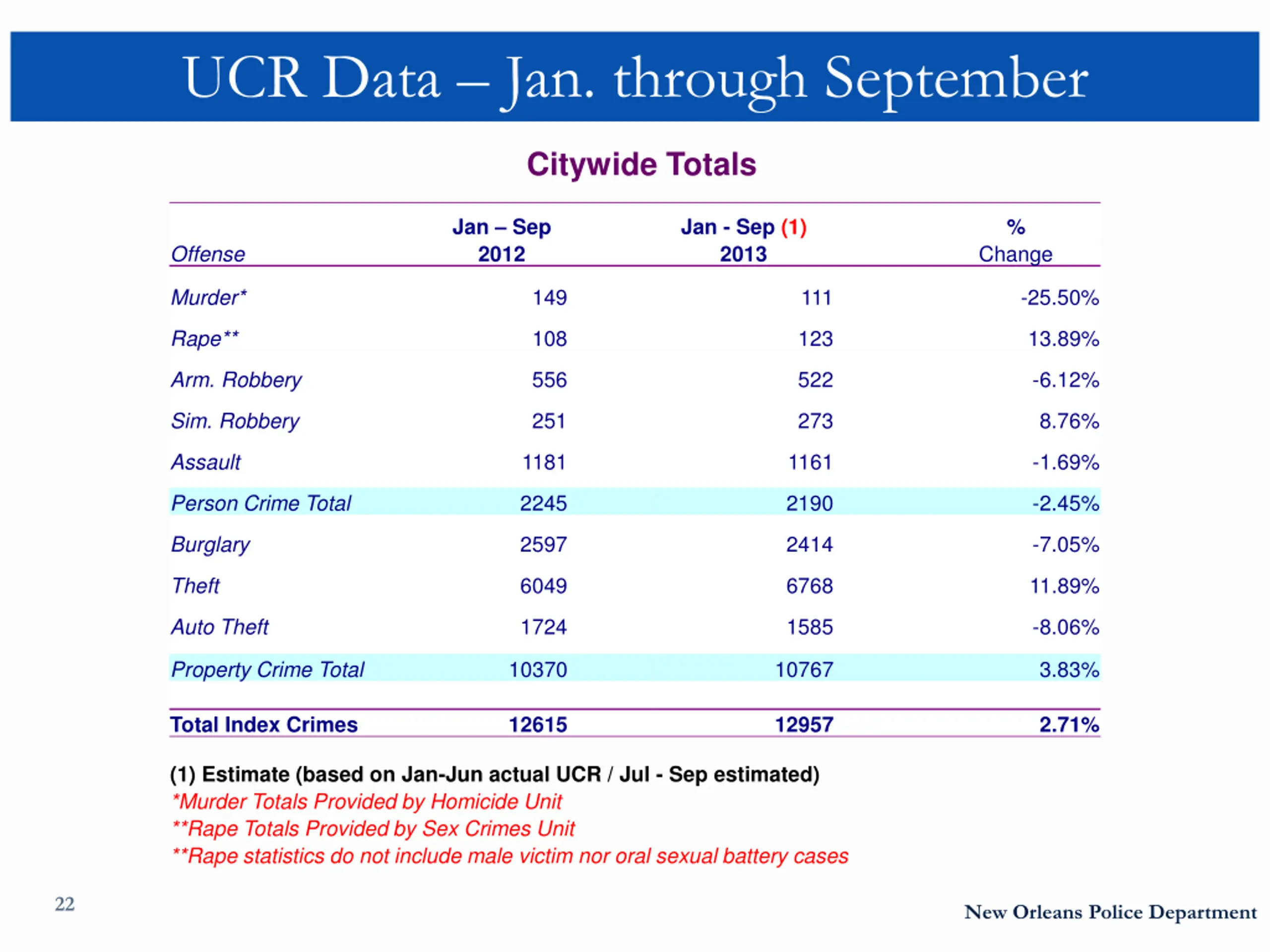 UCR Data Jan. through September Citywide Totals Jan Sep 2012 Jan - Sep (1) 2013 % Offense Change Murder* 149 111 -25.50% Rape** 108 123 13.89% Arm. Robbery 556 522 -6.12% Sim. Robbery 251 273 8.76% Assault 1181 1161 -1.69% Person Crime Total 2245 2190 -2.45% Burglary 2597 2414 -7.05% Theft 6049 6768 11.89% Auto Theft 1724 1585 -8.06% Property Crime Total 10370 10767 3.83% Total Index Crimes 12615 12957 2.71% (1) Estimate (based on Jan-Jun actual UCR / Jul - Sep estimated) *Murder Totals Provided by Homicide Unit **Rape Totals Provided by Sex Crimes Unit **Rape statistics do not include male victim nor oral sexual battery cases 22 New Orleans Police Department