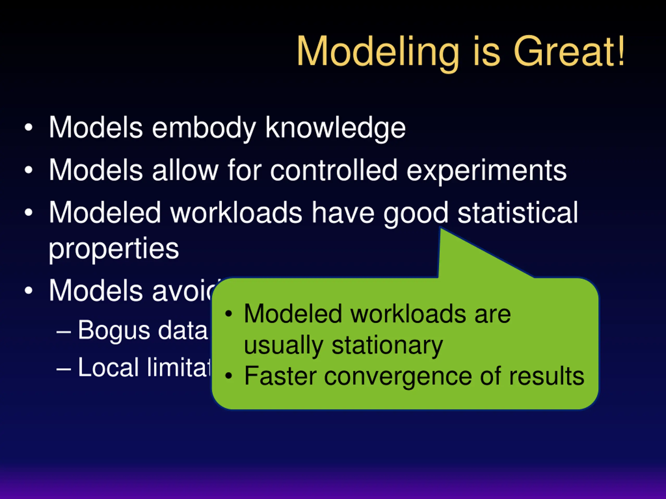 Modeling is Great! Models embody knowledge Models allow for controlled experiments Modeled workloads have good statistical properties Models avoid problems in logs Bogus data Local limitations Faster convergence of results Modeled workloads are usually stationary