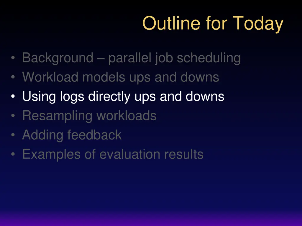 Outline for Today Background parallel job scheduling Workload models ups and downs Using logs directly ups and downs Resampling workloads Adding feedback Examples of evaluation results