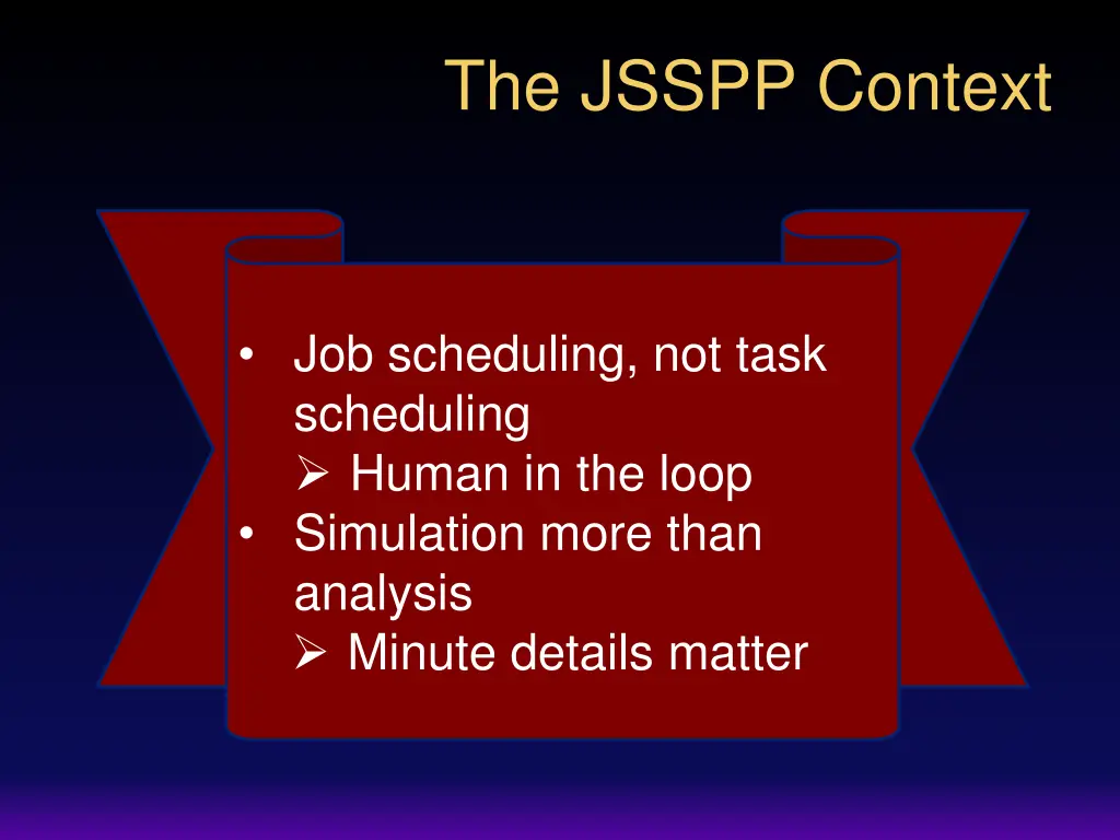 The JSSPP Context Job scheduling, not task scheduling Human in the loop Simulation more than analysis Minute details matter