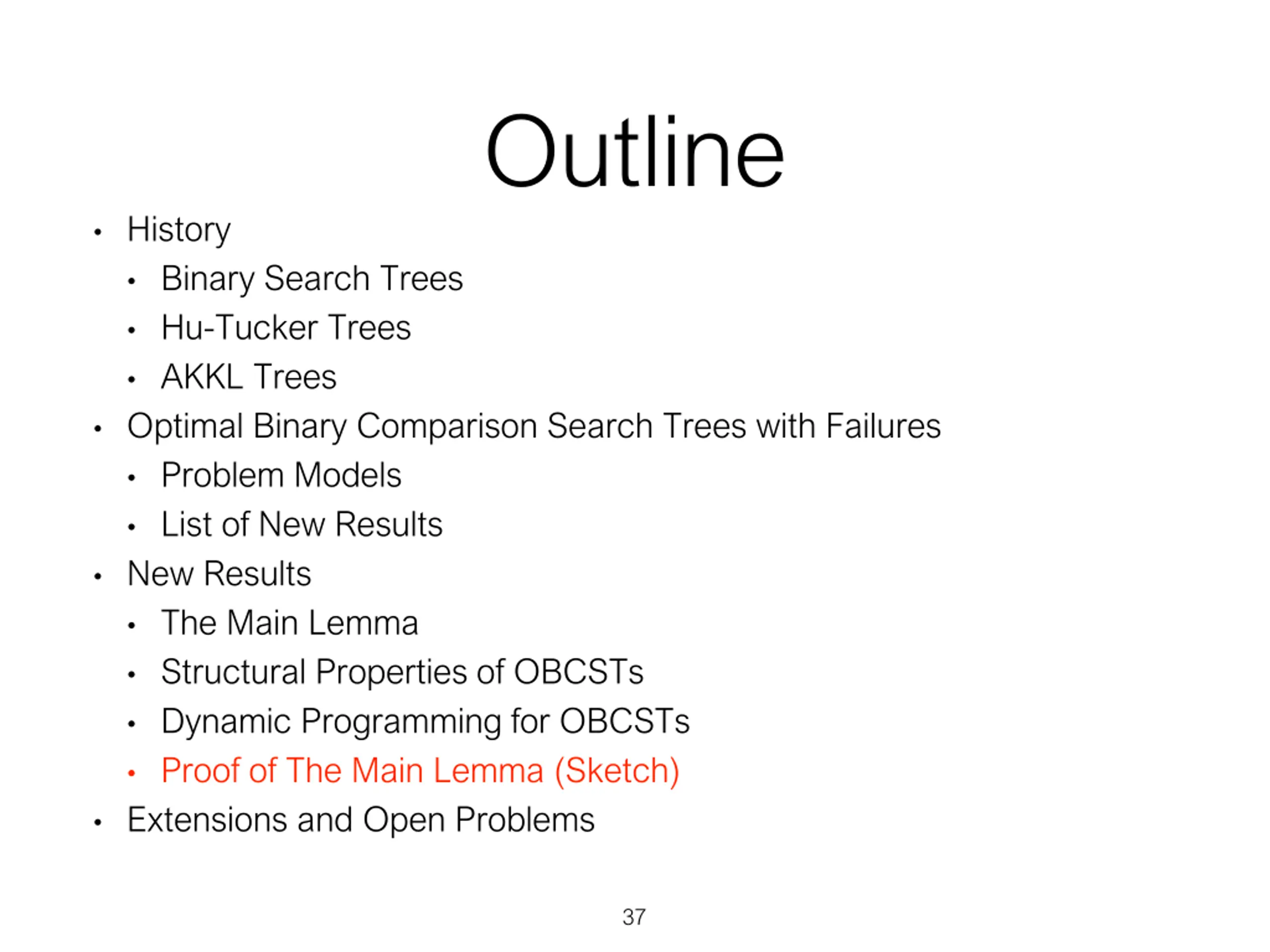 Outline History Binary Search Trees Hu-Tucker Trees AKKL Trees Optimal Binary Comparison Search Trees with Failures Problem Models List of New Results New Results The Main Lemma Structural Properties of OBCSTs Dynamic Programming for OBCSTs Proof of The Main Lemma (Sketch) Extensions and Open Problems 37