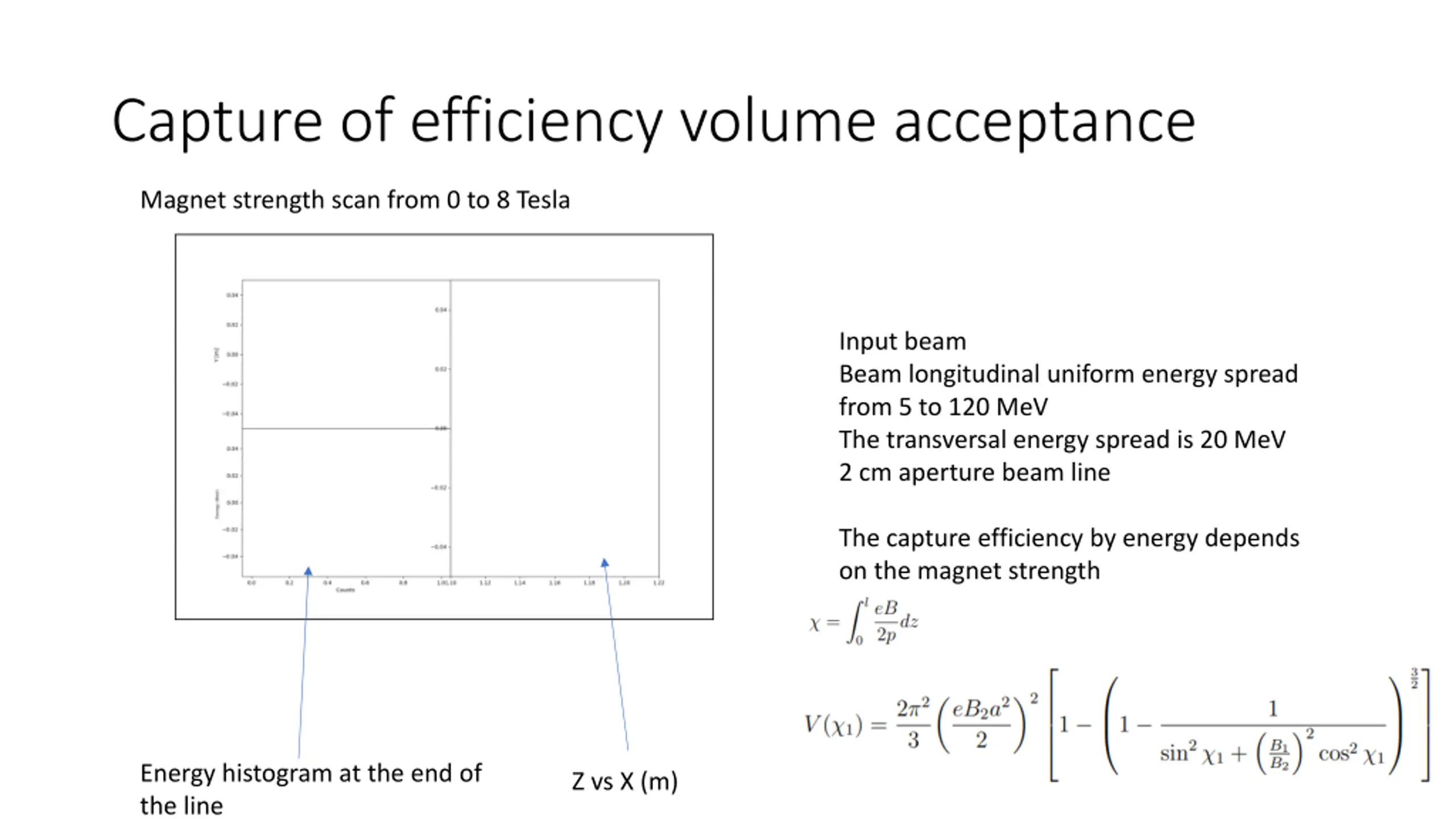 Capture of efficiency volume acceptance Magnet strength scan from 0 to 8 Tesla Input beam Beam longitudinal uniform energy spread from 5 to 120 MeV The transversal energy spread is 20 MeV 2 cm aperture beam line The capture efficiency by energy depends on the magnet strength Energy histogram at the end of the line Z vs X (m)