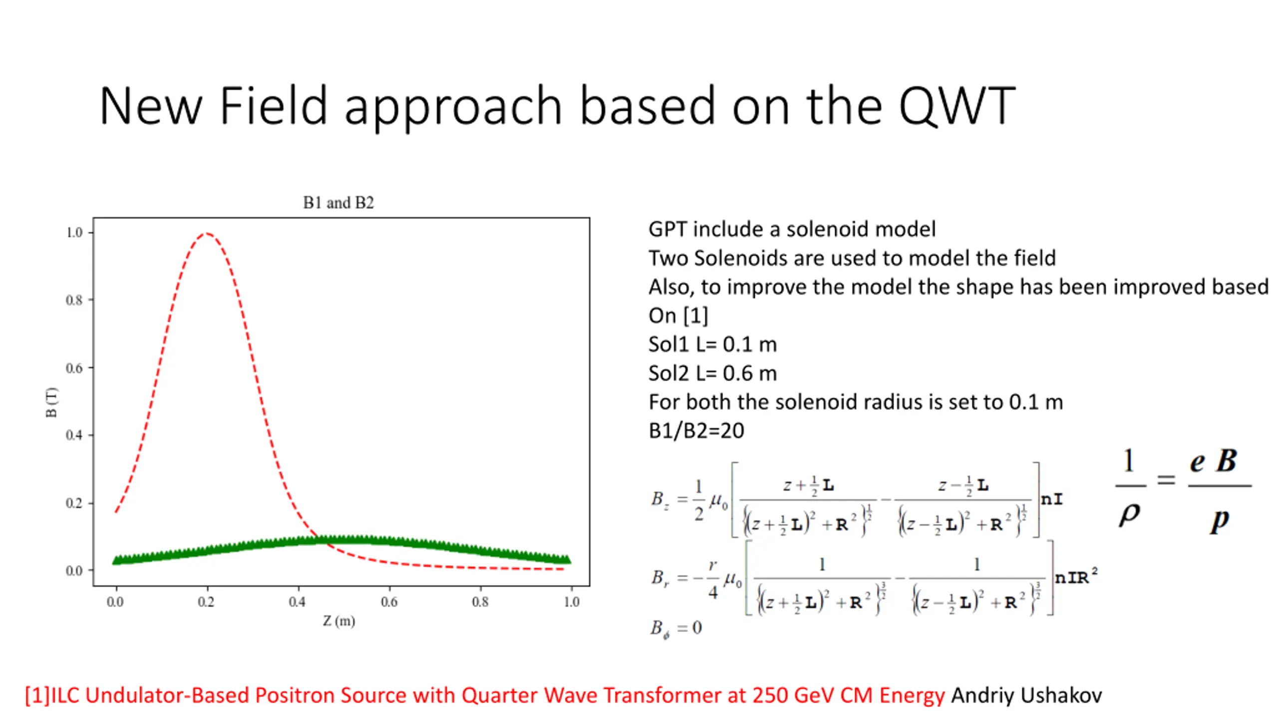 New Field approach based on the QWT GPT include a solenoid model Two Solenoids are used to model the field Also, to improve the model the shape has been improved based On [1] Sol1 L= 0.1 m Sol2 L= 0.6 m For both the solenoid radius is set to 0.1 m B1/B2=20 [1]ILC Undulator-Based Positron Source with Quarter Wave Transformer at 250 GeV CM Energy Andriy Ushakov