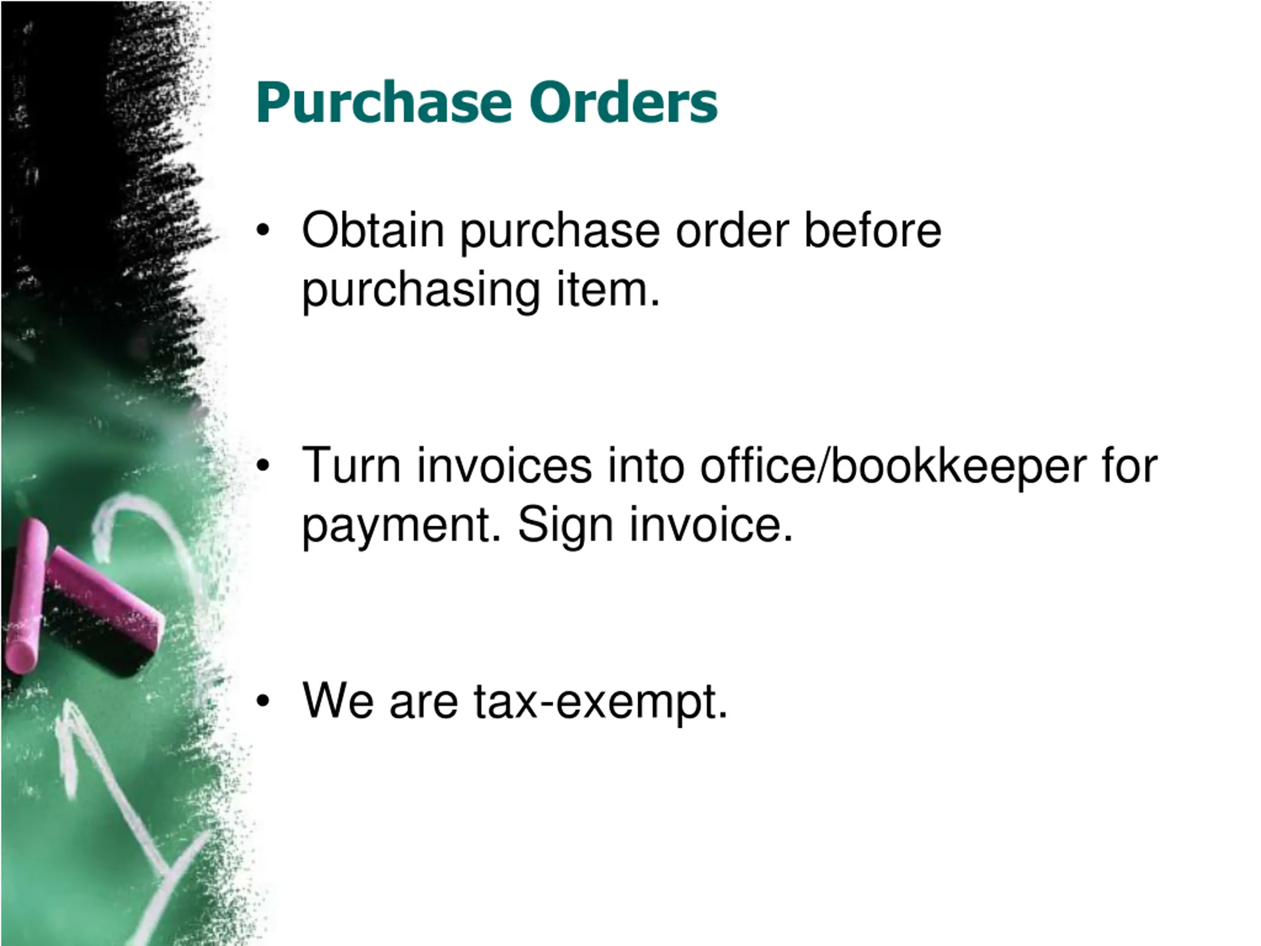 Purchase Orders Obtain purchase order before purchasing item. Turn invoices into office/bookkeeper for payment. Sign invoice. We are tax-exempt.