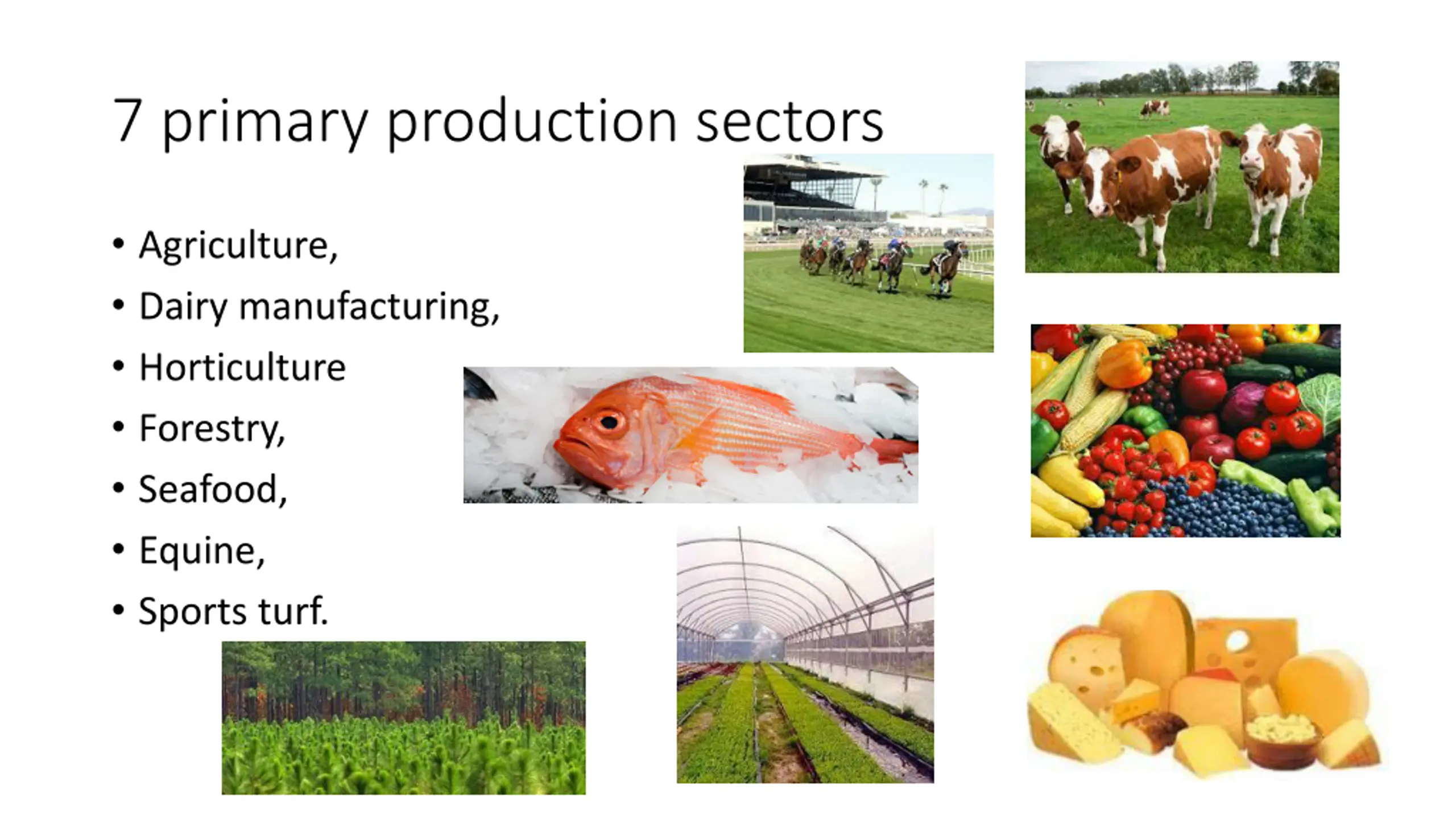 7 primary production sectors Agriculture, Dairy manufacturing, Horticulture Forestry, Seafood, Equine, Sports turf.