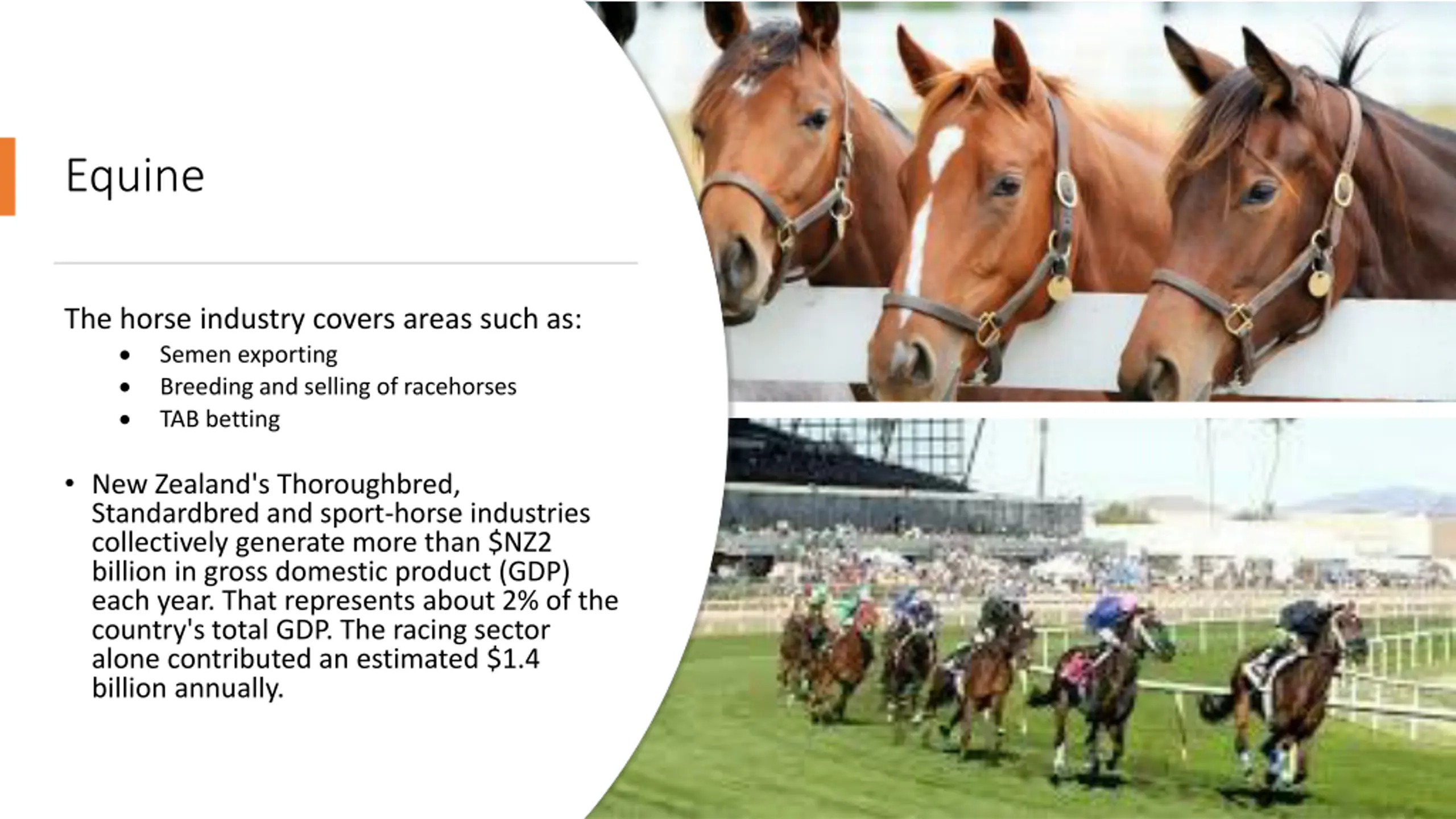 Equine The horse industry covers areas such as: Semen exporting Breeding and selling of racehorses TAB betting New Zealand's Thoroughbred, Standardbred and sport-horse industries collectively generate more than $NZ2 billion in gross domestic product (GDP) each year. That represents about 2% of the country's total GDP. The racing sector alone contributed an estimated $1.4 billion annually.