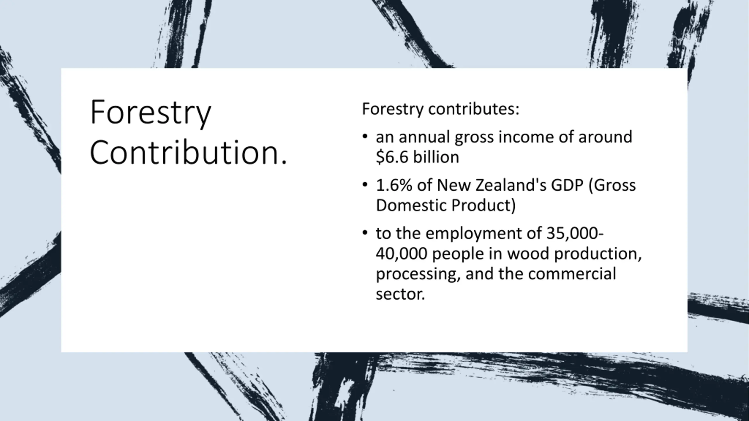 Forestry Contribution. Forestry contributes: an annual gross income of around $6.6 billion 1.6% of New Zealand's GDP (Gross Domestic Product) to the employment of 35,000- 40,000 people in wood production, processing, and the commercial sector.