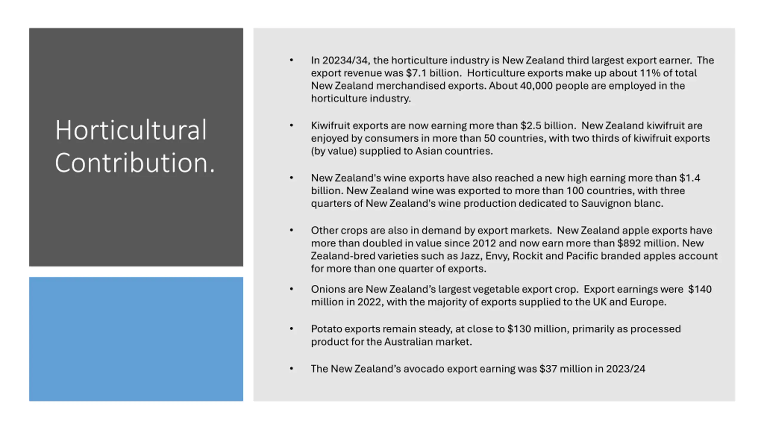 In 20234/34, the horticulture industry is New Zealand third largest export earner. The export revenue was $7.1 billion. Horticulture exports make up about 11% of total New Zealand merchandised exports. About 40,000 people are employed in the horticulture industry. Horticultural Contribution. Kiwifruit exports are now earning more than $2.5 billion. New Zealand kiwifruit are enjoyed by consumers in more than 50 countries, with two thirds of kiwifruit exports (by value) supplied to Asian countries. New Zealand's wine exports have also reached a new high earning more than $1.4 billion. New Zealand wine was exported to more than 100 countries, with three quarters of New Zealand's wine production dedicated to Sauvignon blanc. Other crops are also in demand by export markets. New Zealand apple exports have more than doubled in value since 2012 and now earn more than $892 million. New Zealand-bred varieties such as Jazz, Envy, Rockit and Pacific branded apples account for more than one quarter of exports. Onions are New Zealand s largest vegetable export crop. Export earnings were $140 million in 2022, with the majority of exports supplied to the UK and Europe. Potato exports remain steady, at close to $130 million, primarily as processed product for the Australian market. The New Zealand s avocado export earning was $37 million in 2023/24