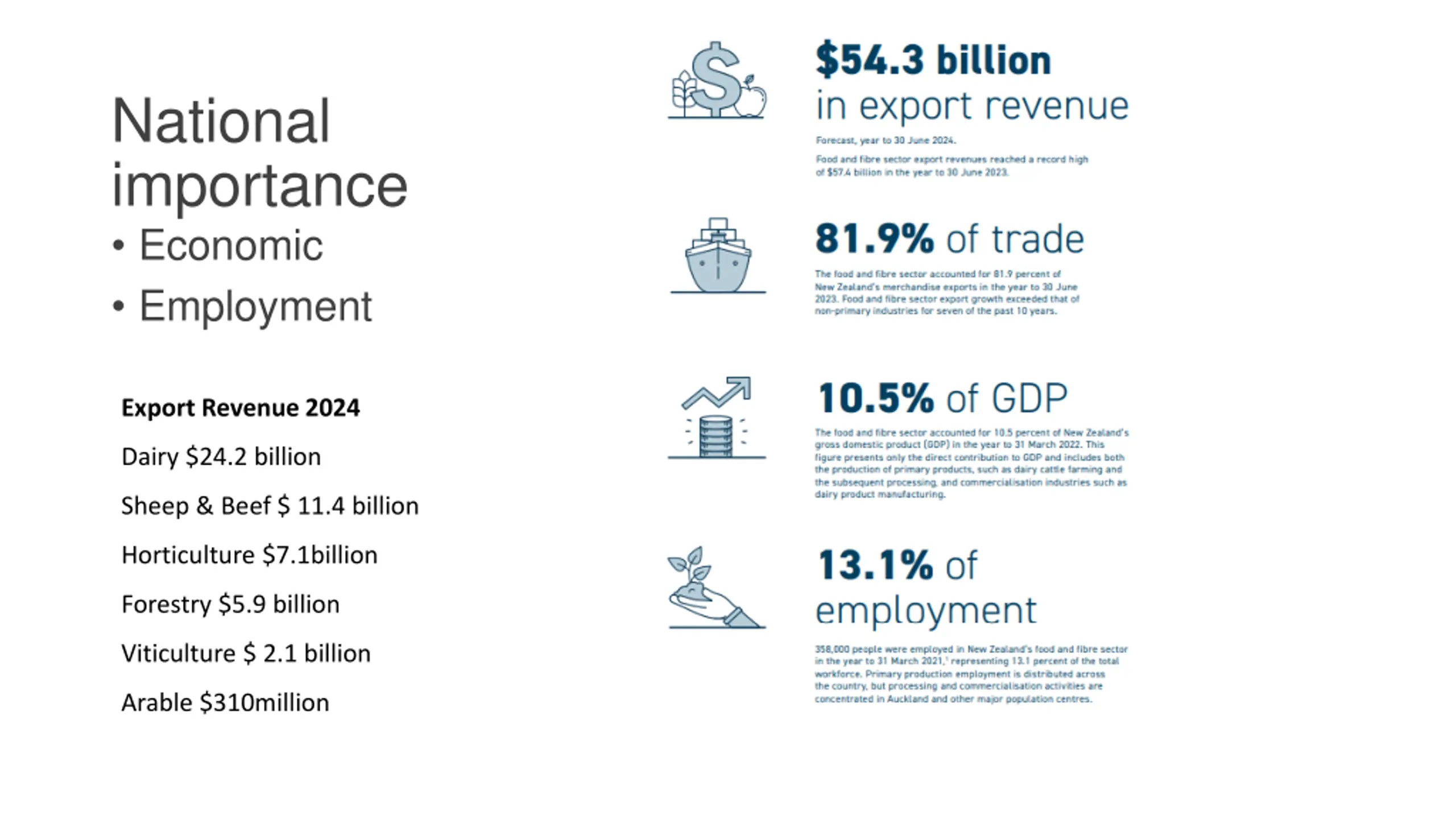 National importance Economic Employment Export Revenue 2024 Dairy $24.2 billion Sheep & Beef $ 11.4 billion Horticulture $7.1billion Forestry $5.9 billion Viticulture $ 2.1 billion Arable $310million