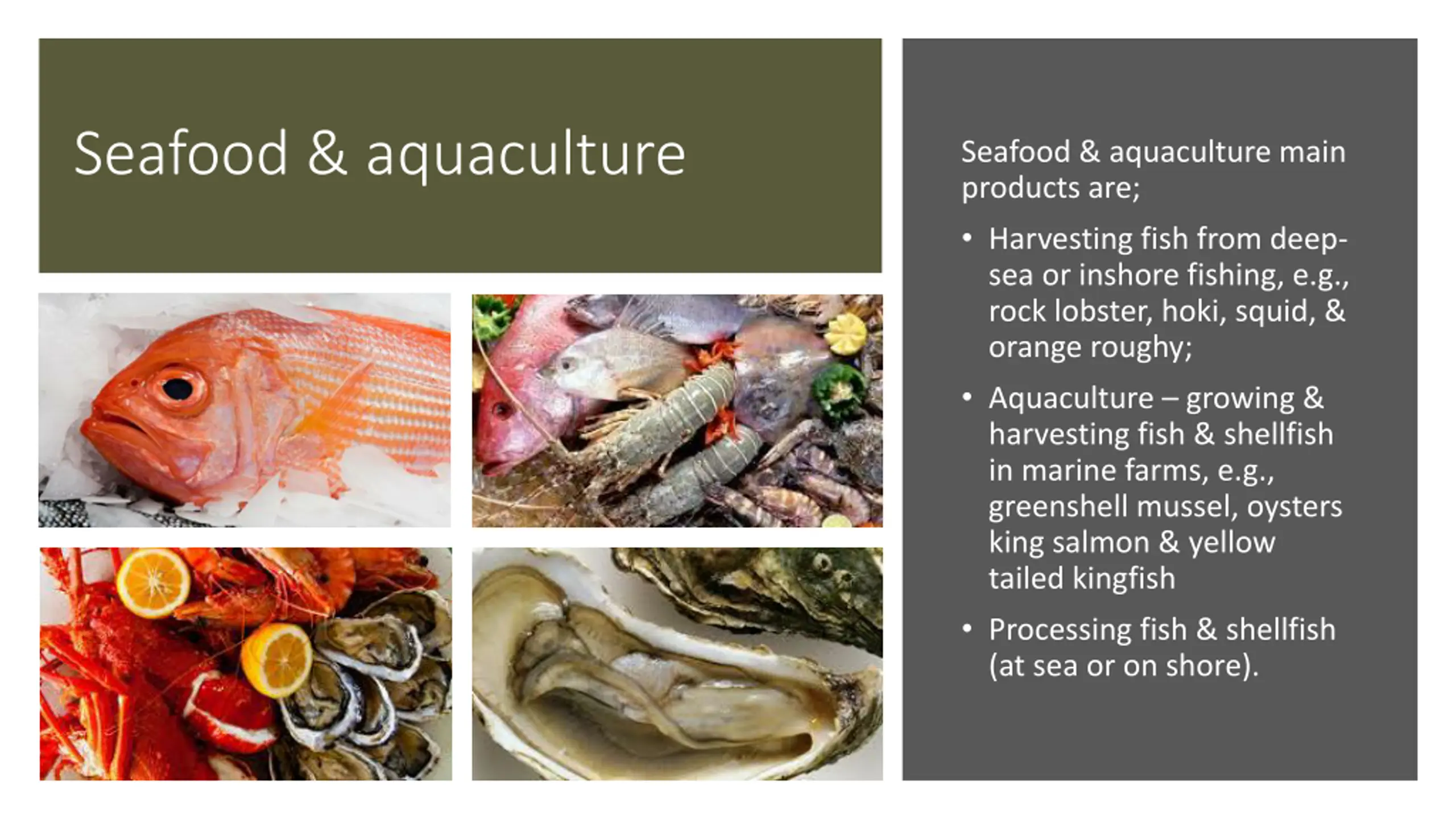 Seafood & aquaculture Seafood & aquaculture main products are; Harvesting fish from deep- sea or inshore fishing, e.g., rock lobster, hoki, squid, & orange roughy; Aquaculture growing & harvesting fish & shellfish in marine farms, e.g., greenshell mussel, oysters king salmon & yellow tailed kingfish Processing fish & shellfish (at sea or on shore).
