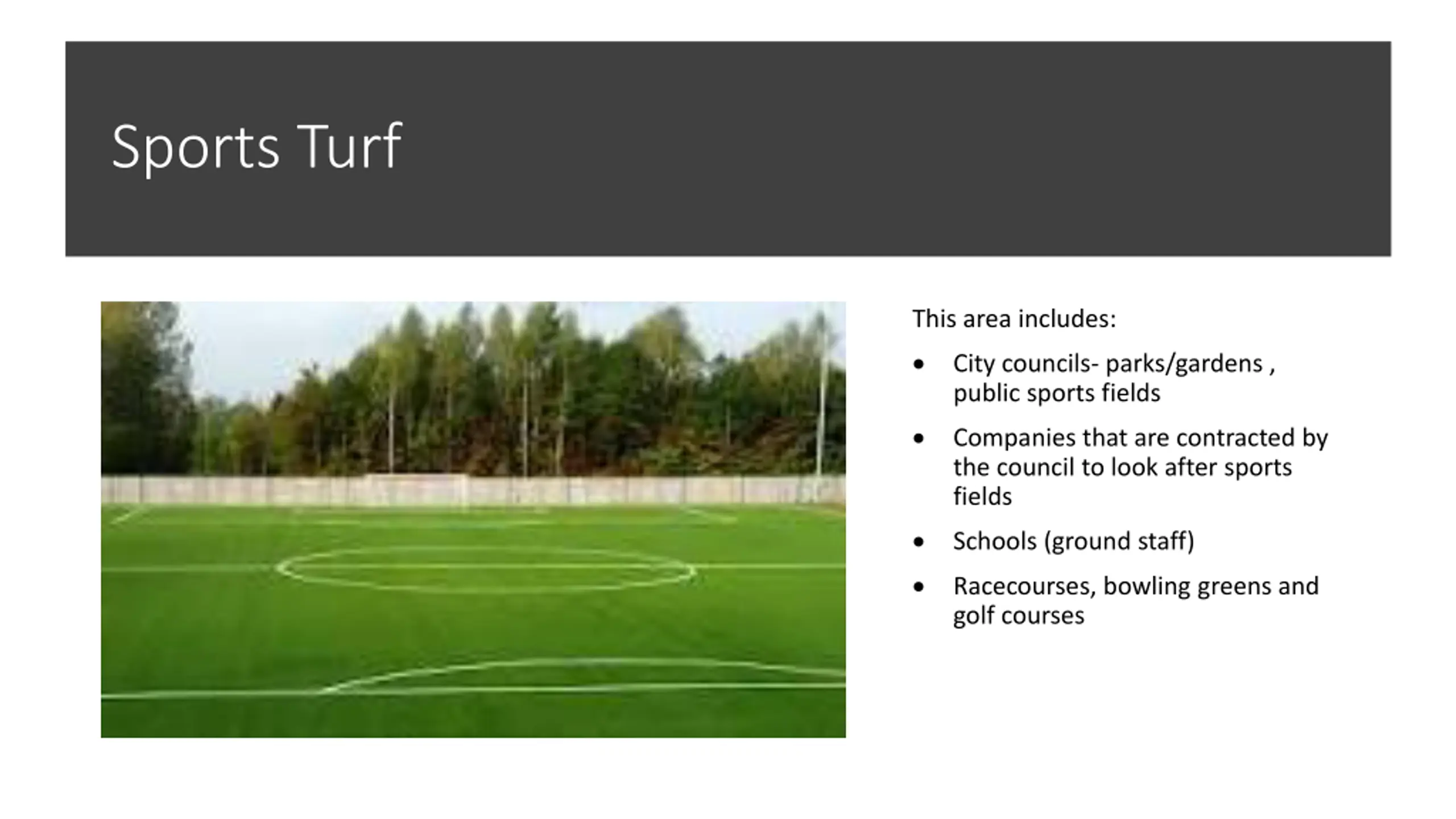 Sports Turf This area includes: City councils- parks/gardens , public sports fields Companies that are contracted by the council to look after sports fields Schools (ground staff) Racecourses, bowling greens and golf courses