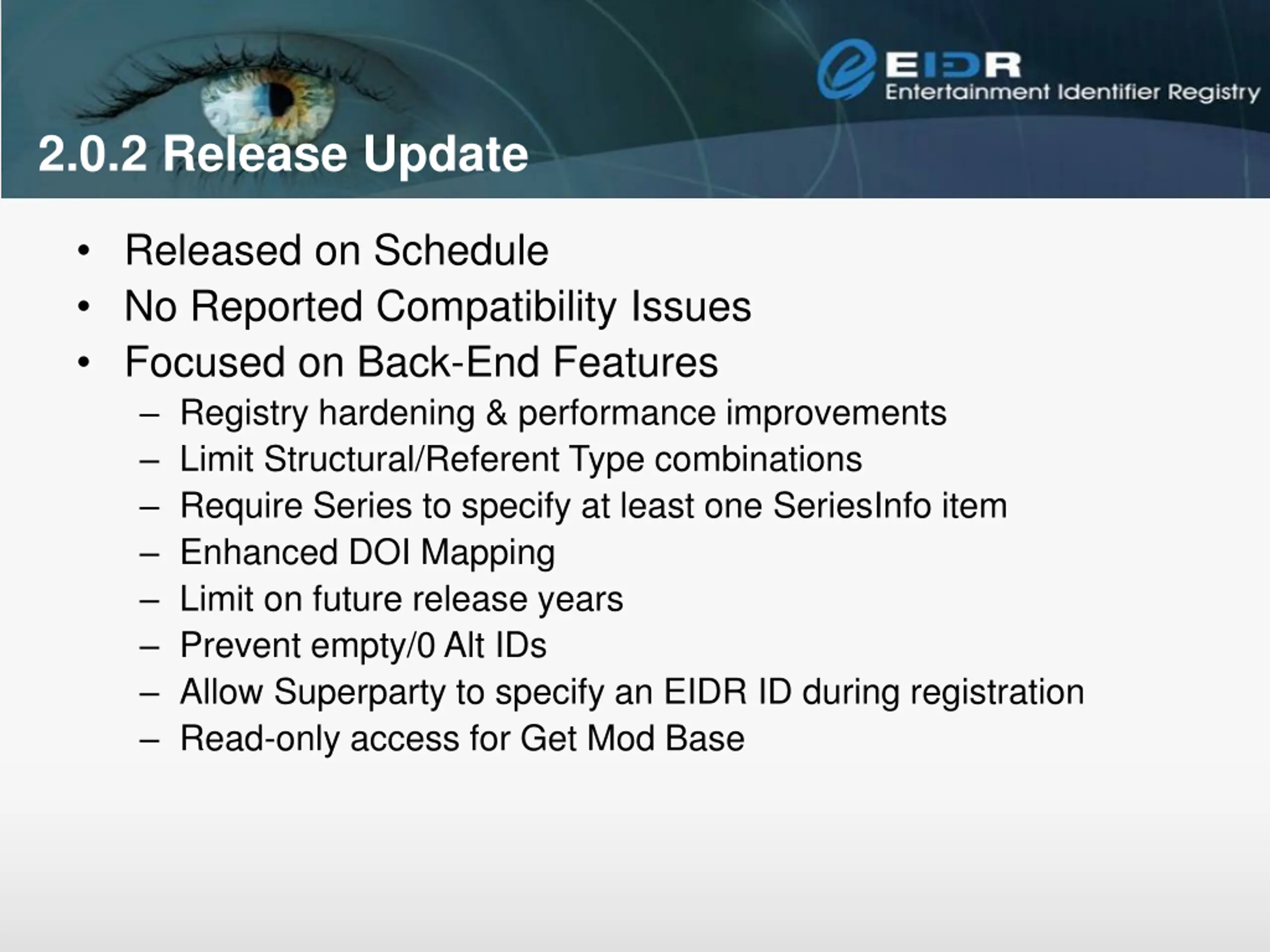 2.0.2 Release Update Released on Schedule No Reported Compatibility Issues Focused on Back-End Features Registry hardening & performance improvements Limit Structural/Referent Type combinations Require Series to specify at least one SeriesInfo item Enhanced DOI Mapping Limit on future release years Prevent empty/0 Alt IDs Allow Superparty to specify an EIDR ID during registration Read-only access for Get Mod Base