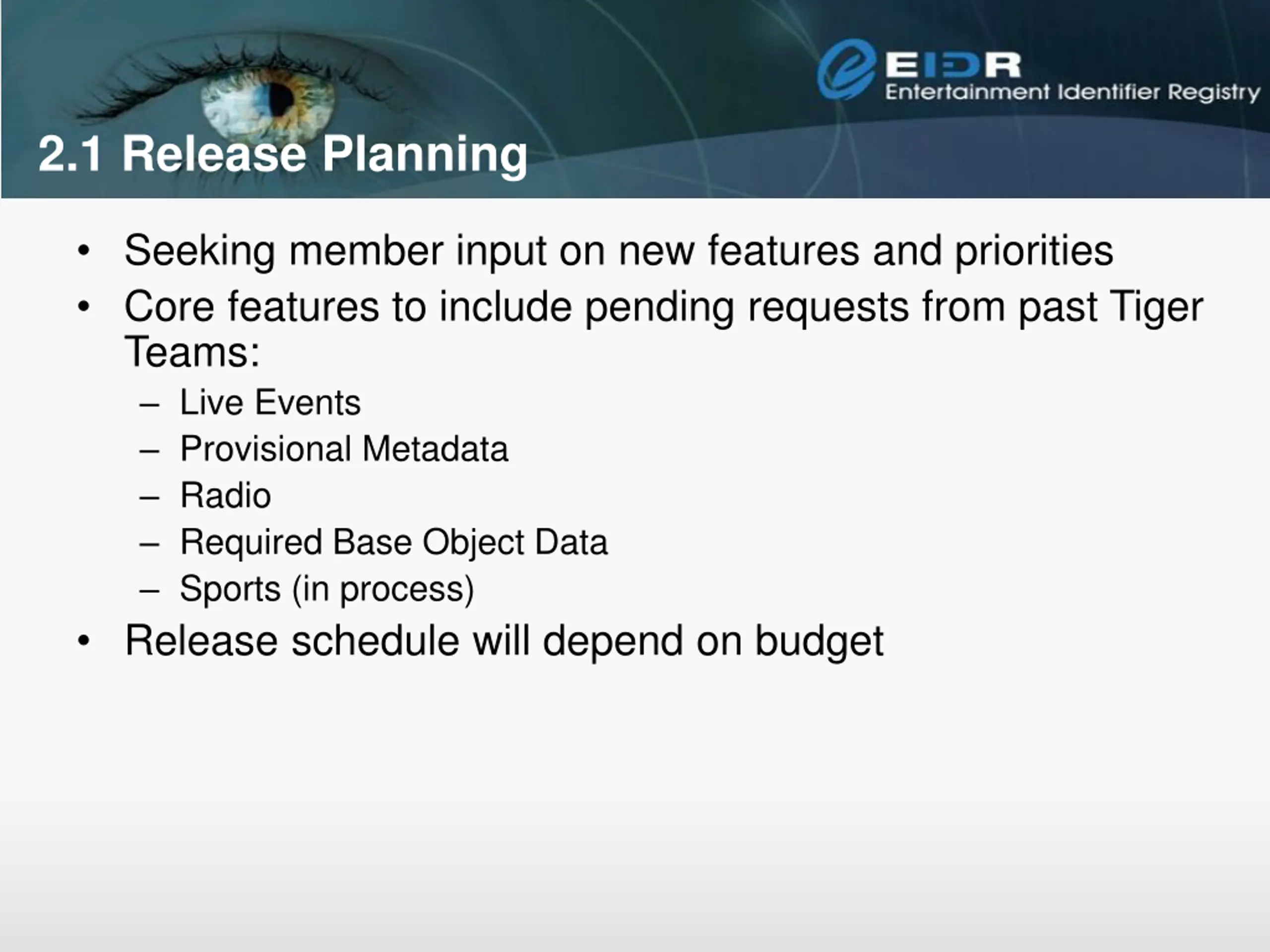2.1 Release Planning Seeking member input on new features and priorities Core features to include pending requests from past Tiger Teams: Live Events Provisional Metadata Radio Required Base Object Data Sports (in process) Release schedule will depend on budget