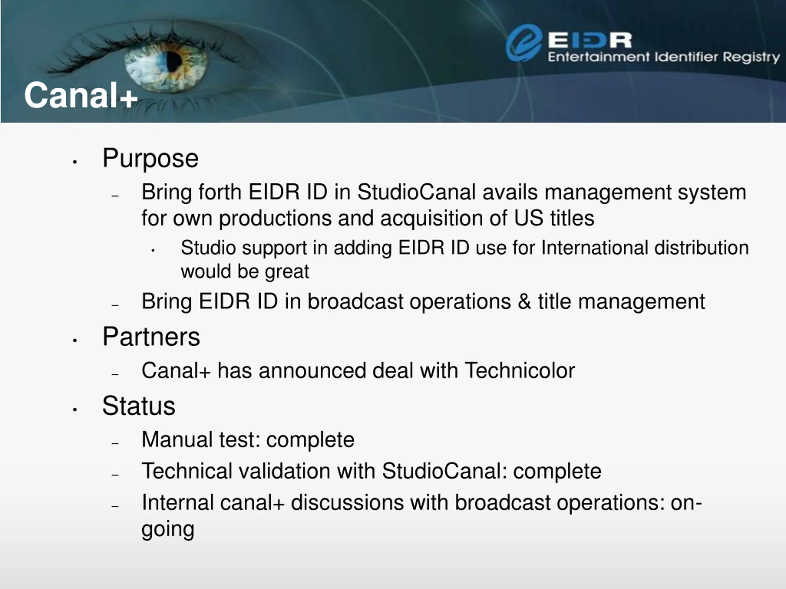 Canal+ Purpose Bring forth EIDR ID in StudioCanal avails management system for own productions and acquisition of US titles Studio support in adding EIDR ID use for International distribution would be great Bring EIDR ID in broadcast operations & title management Partners Canal+ has announced deal with Technicolor Status Manual test: complete Technical validation with StudioCanal: complete Internal canal+ discussions with broadcast operations: on- going
