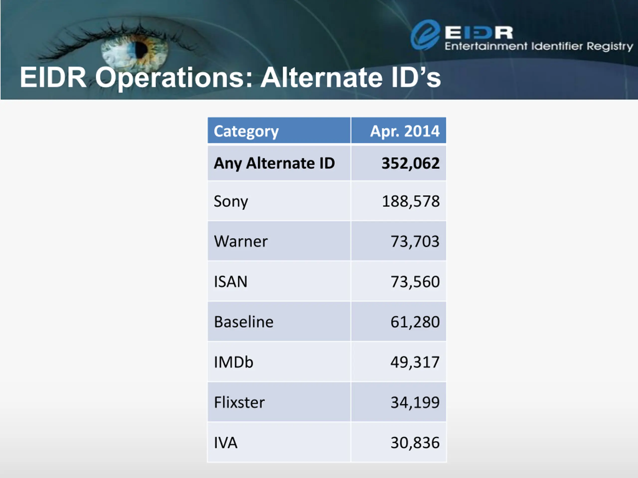 EIDR Operations: Alternate IDs Category Apr. 2014 Any Alternate ID 352,062 Sony 188,578 Warner 73,703 ISAN 73,560 Baseline 61,280 IMDb 49,317 Flixster 34,199 IVA 30,836