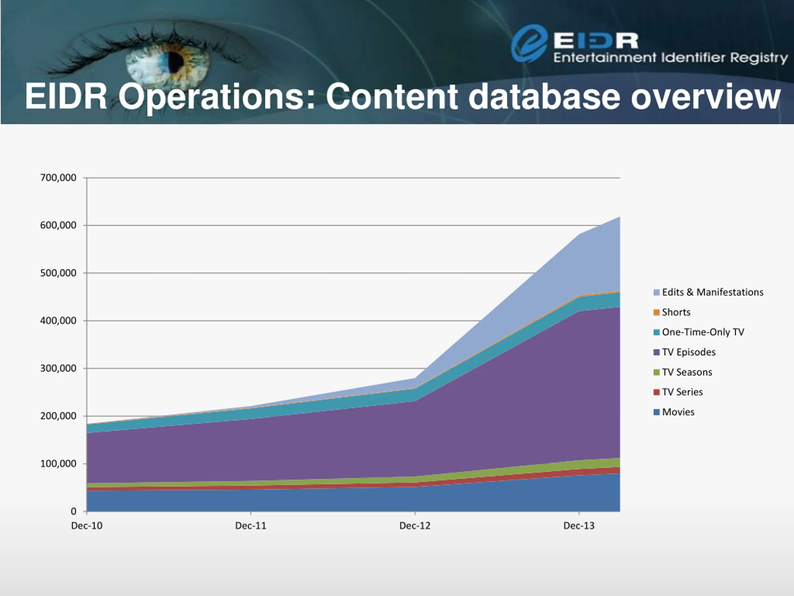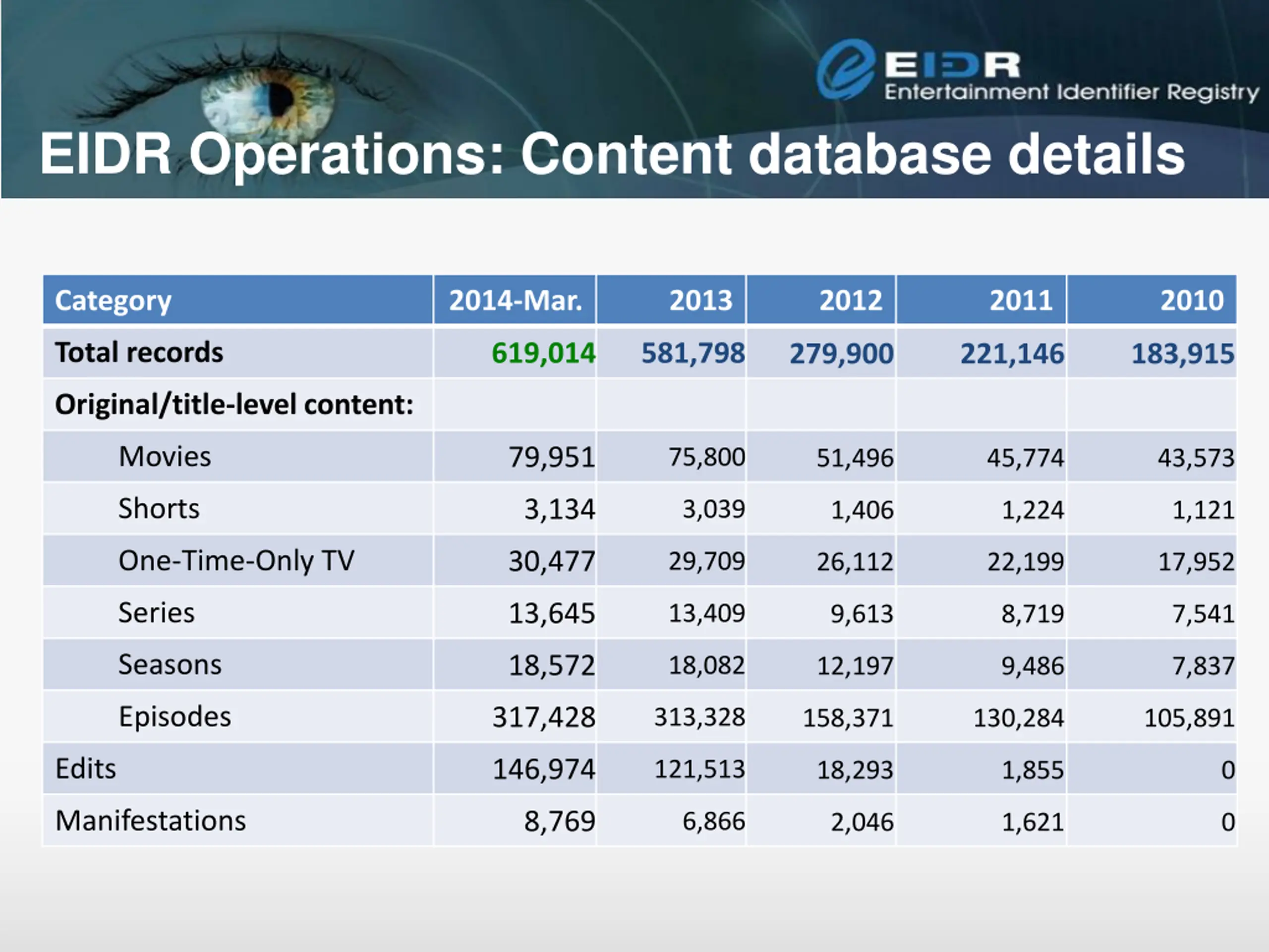 EIDR Operations: Content database details Category 2014-Mar. 2013 2012 2011 2010 Total records 619,014 581,798 279,900 221,146 183,915 Original/title-level content: Movies 79,951 75,800 51,496 45,774 43,573 Shorts 3,134 3,039 1,406 1,224 1,121 One-Time-Only TV 30,477 29,709 26,112 22,199 17,952 Series 13,645 13,409 9,613 8,719 7,541 Seasons 18,572 18,082 12,197 9,486 7,837 Episodes 317,428 313,328 158,371 130,284 105,891 Edits 146,974 121,513 18,293 1,855 0 Manifestations 8,769 6,866 2,046 1,621 0