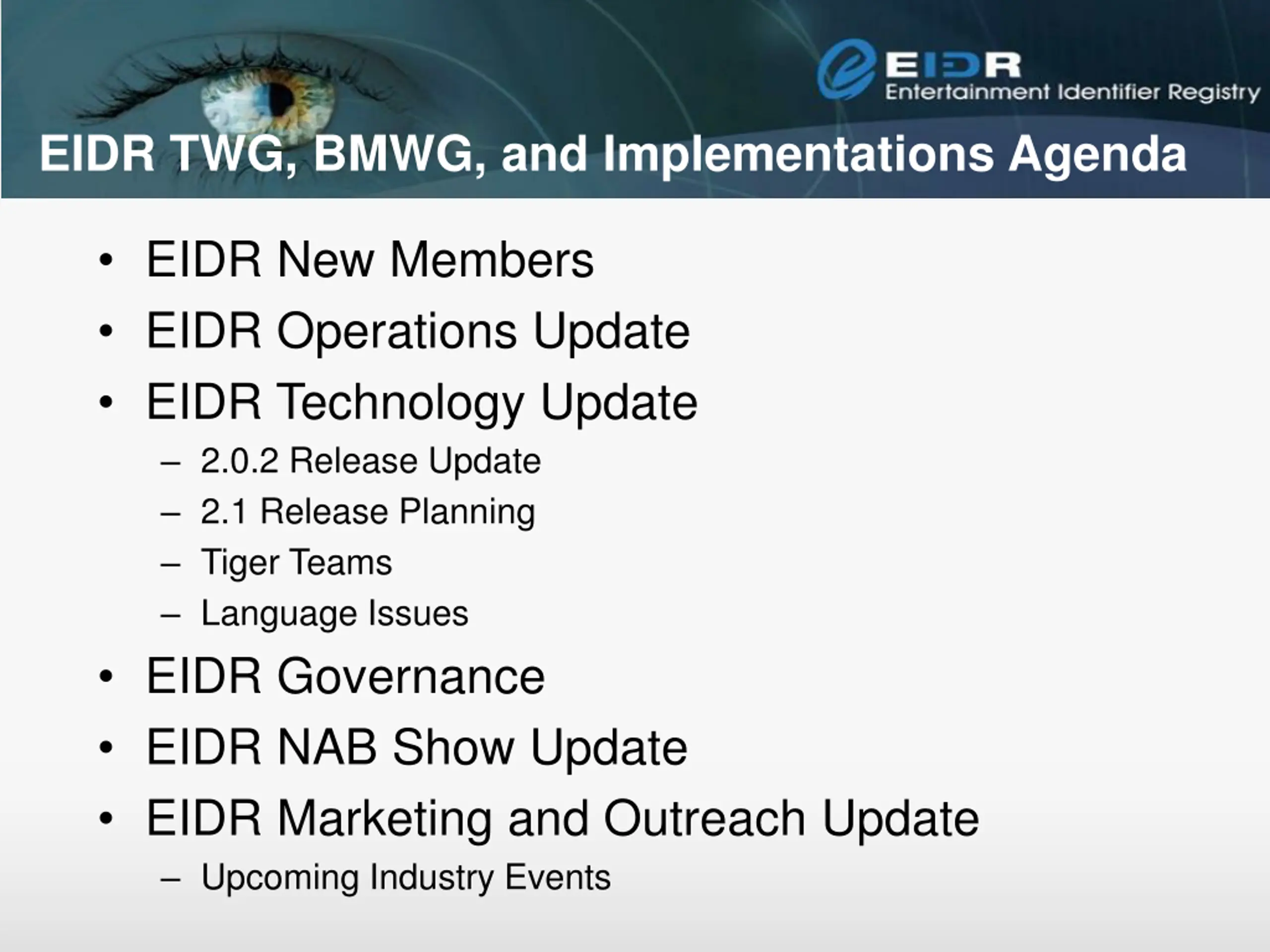EIDR TWG, BMWG, and Implementations Agenda EIDR New Members EIDR Operations Update EIDR Technology Update 2.0.2 Release Update 2.1 Release Planning Tiger Teams Language Issues EIDR Governance EIDR NAB Show Update EIDR Marketing and Outreach Update Upcoming Industry Events