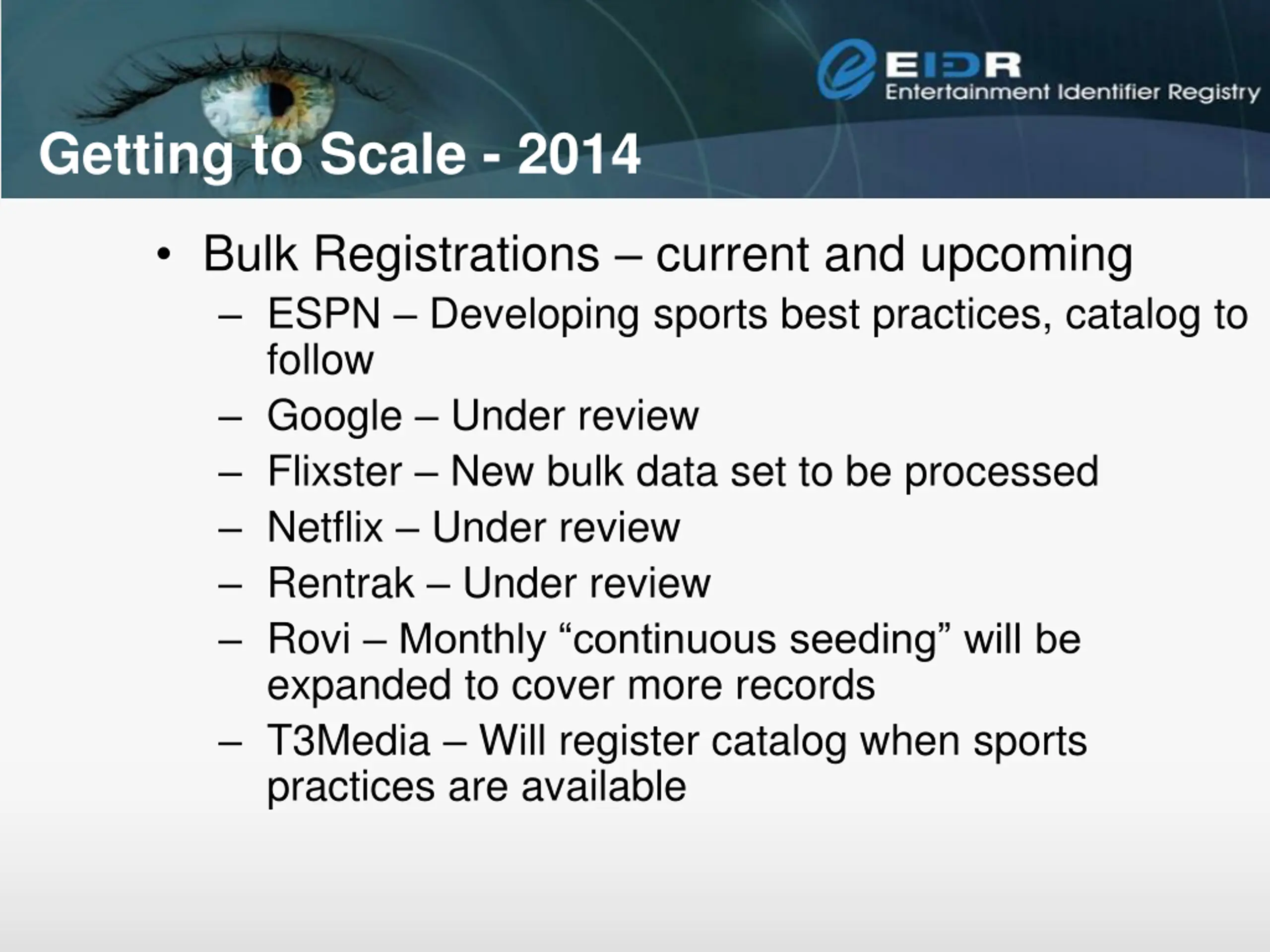 Getting to Scale - 2014 Bulk Registrations current and upcoming ESPN Developing sports best practices, catalog to follow Google Under review Flixster New bulk data set to be processed Netflix Under review Rentrak Under review Rovi Monthly continuous seeding will be expanded to cover more records T3Media Will register catalog when sports practices are available