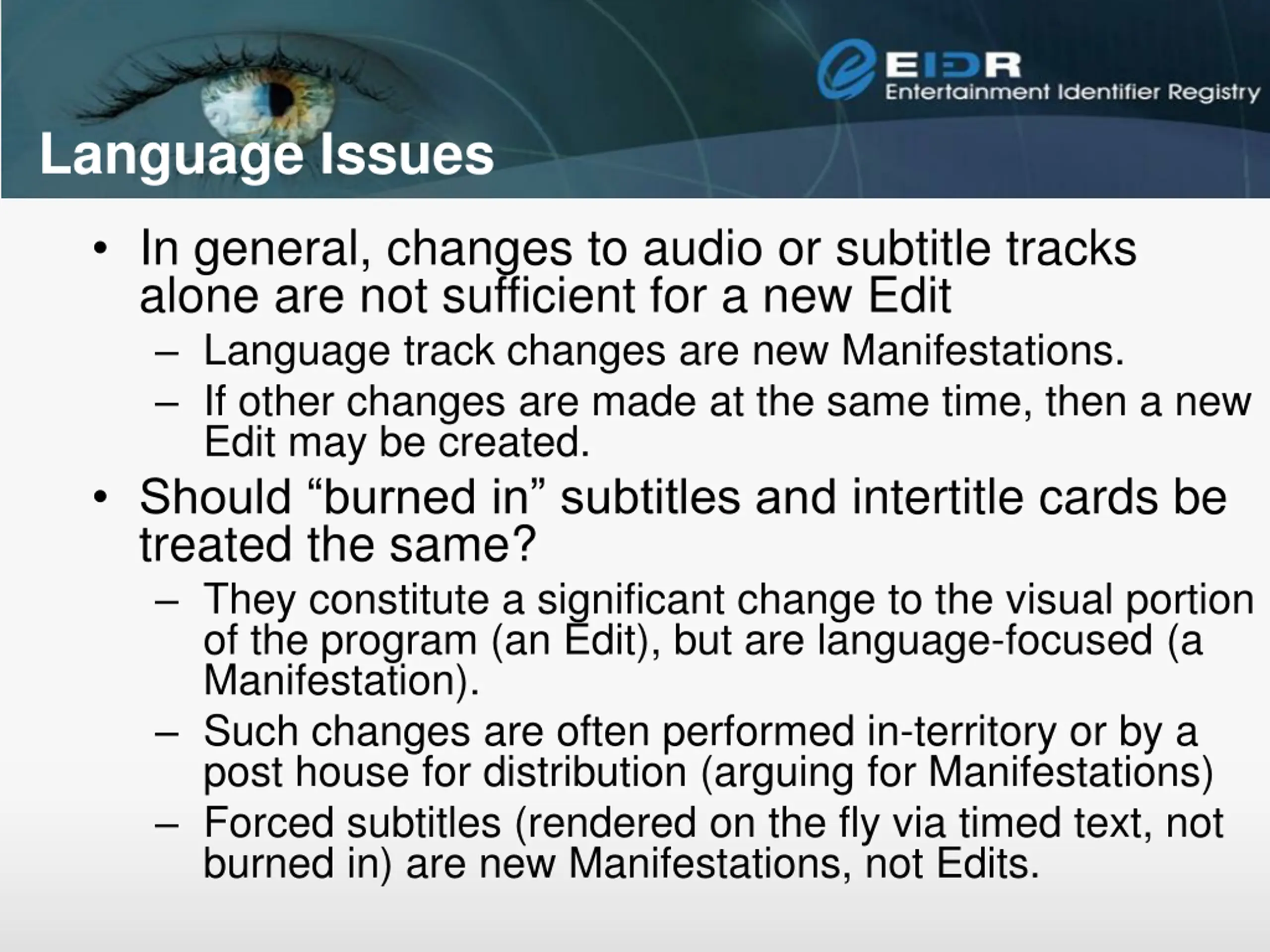 Language Issues In general, changes to audio or subtitle tracks alone are not sufficient for a new Edit Language track changes are new Manifestations. If other changes are made at the same time, then a new Edit may be created. Should burned in subtitles and intertitle cards be treated the same? They constitute a significant change to the visual portion of the program (an Edit), but are language-focused (a Manifestation). Such changes are often performed in-territory or by a post house for distribution (arguing for Manifestations) Forced subtitles (rendered on the fly via timed text, not burned in) are new Manifestations, not Edits.