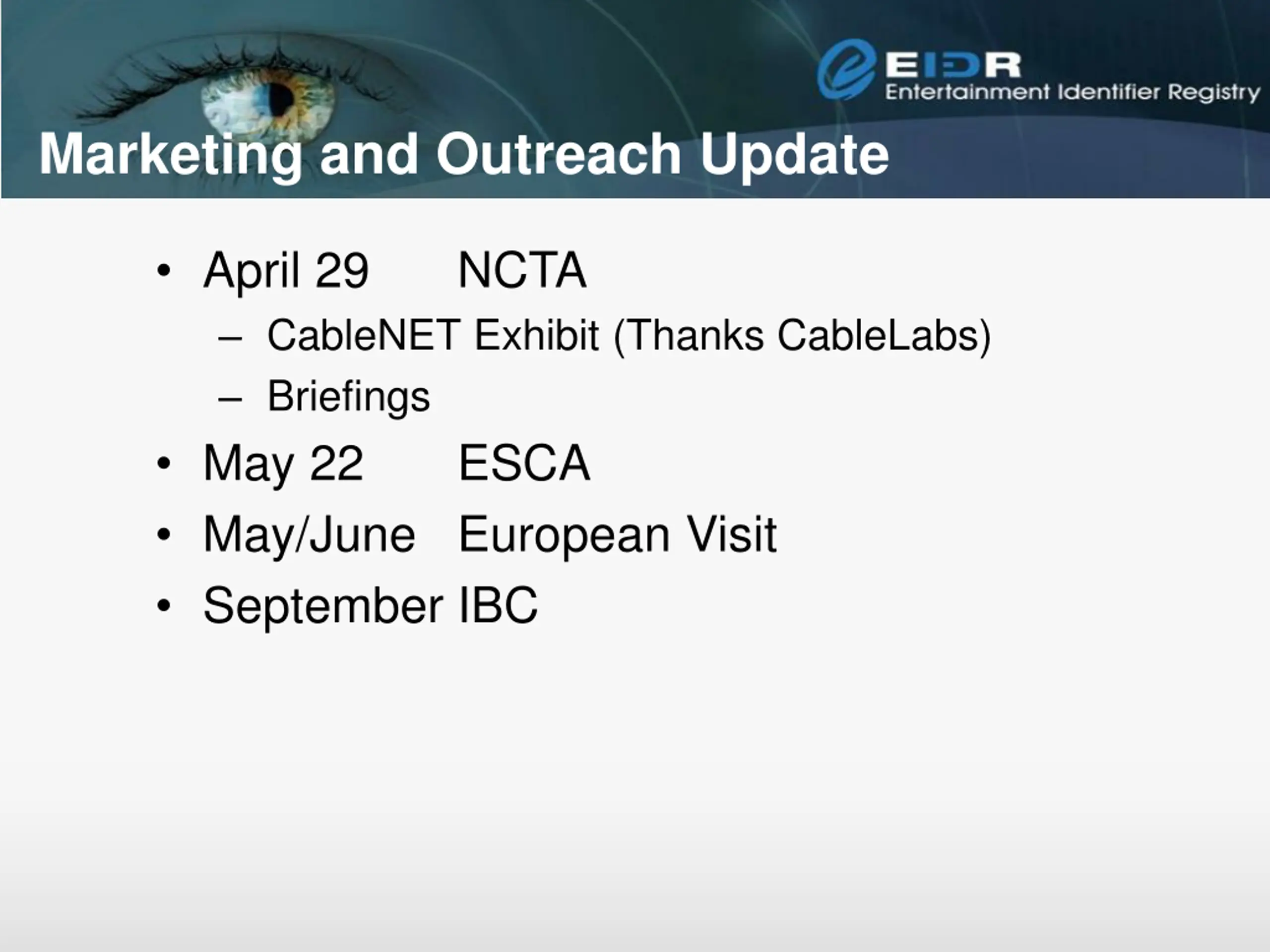 Marketing and Outreach Update April 29 CableNET Exhibit (Thanks CableLabs) Briefings May 22 ESCA May/June European Visit September IBC NCTA