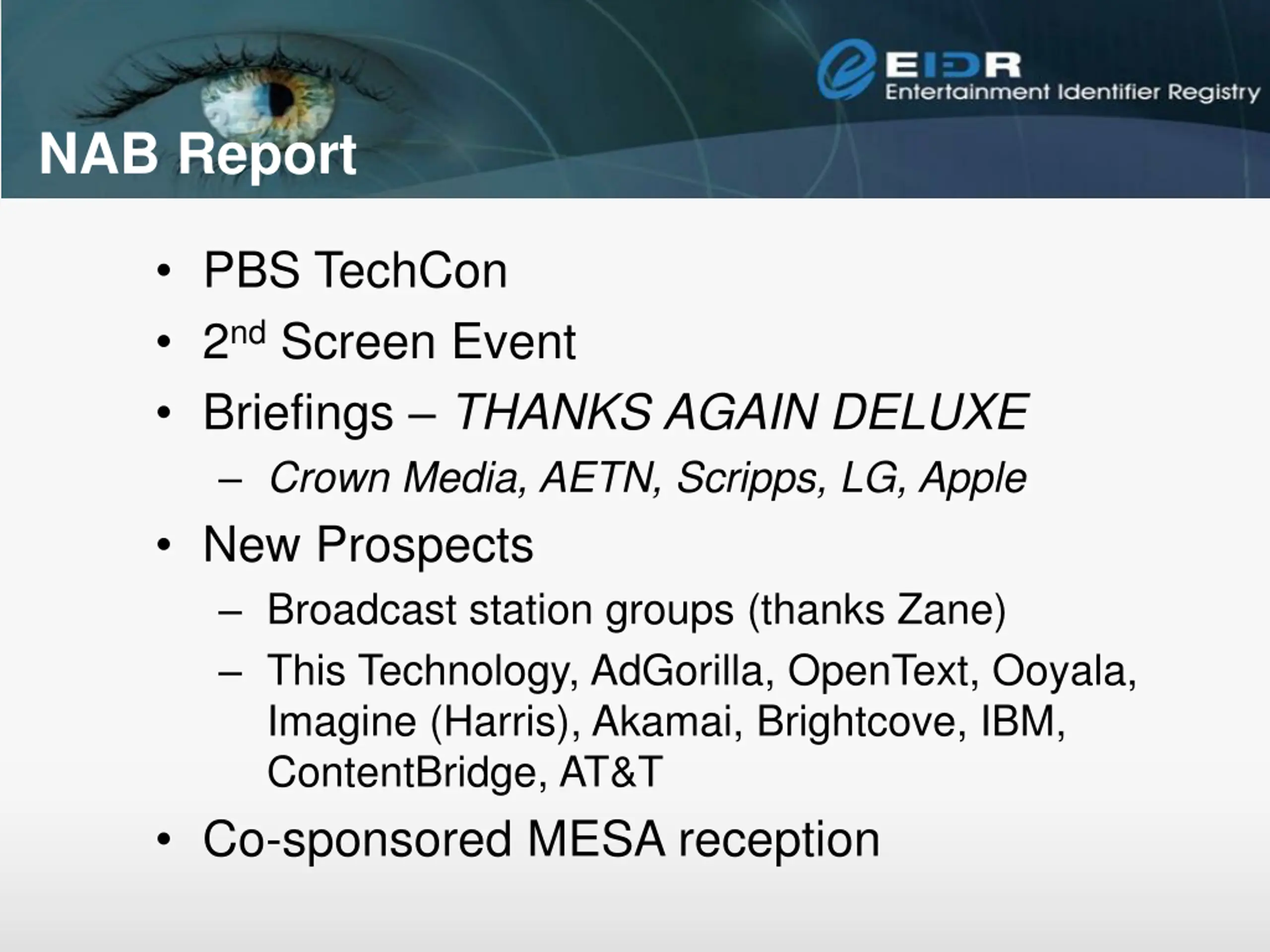 NAB Report PBS TechCon 2nd Screen Event Briefings THANKS AGAIN DELUXE Crown Media, AETN, Scripps, LG, Apple New Prospects Broadcast station groups (thanks Zane) This Technology, AdGorilla, OpenText, Ooyala, Imagine (Harris), Akamai, Brightcove, IBM, ContentBridge, AT&T Co-sponsored MESA reception