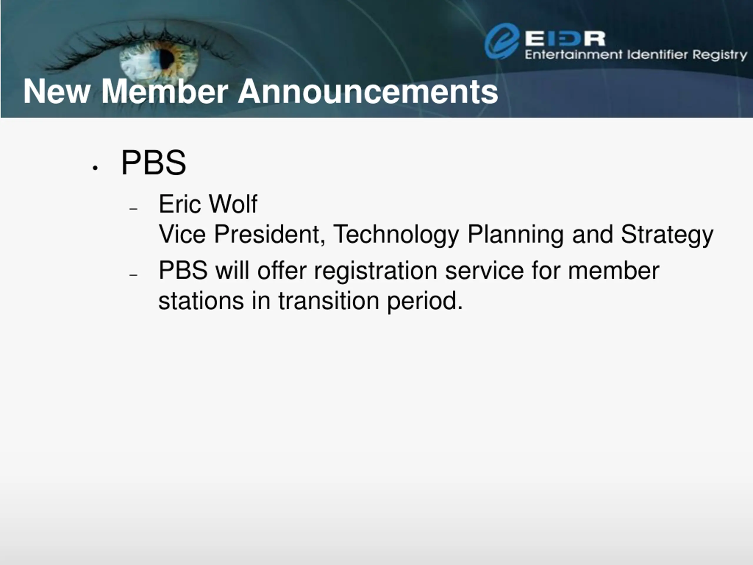 New Member Announcements PBS Eric Wolf Vice President, Technology Planning and Strategy PBS will offer registration service for member stations in transition period.
