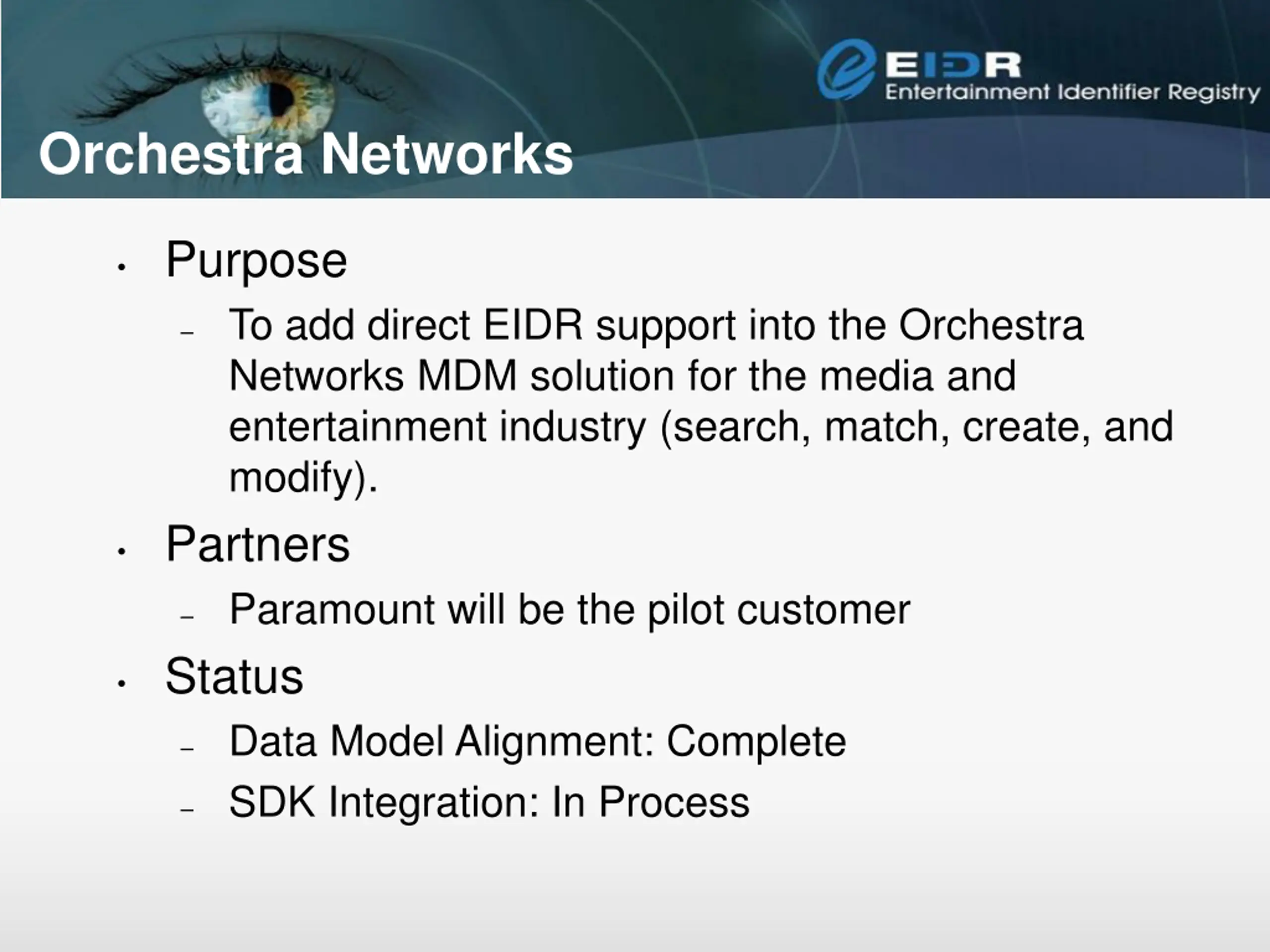 Orchestra Networks Purpose To add direct EIDR support into the Orchestra Networks MDM solution for the media and entertainment industry (search, match, create, and modify). Partners Paramount will be the pilot customer Status Data Model Alignment: Complete SDK Integration: In Process