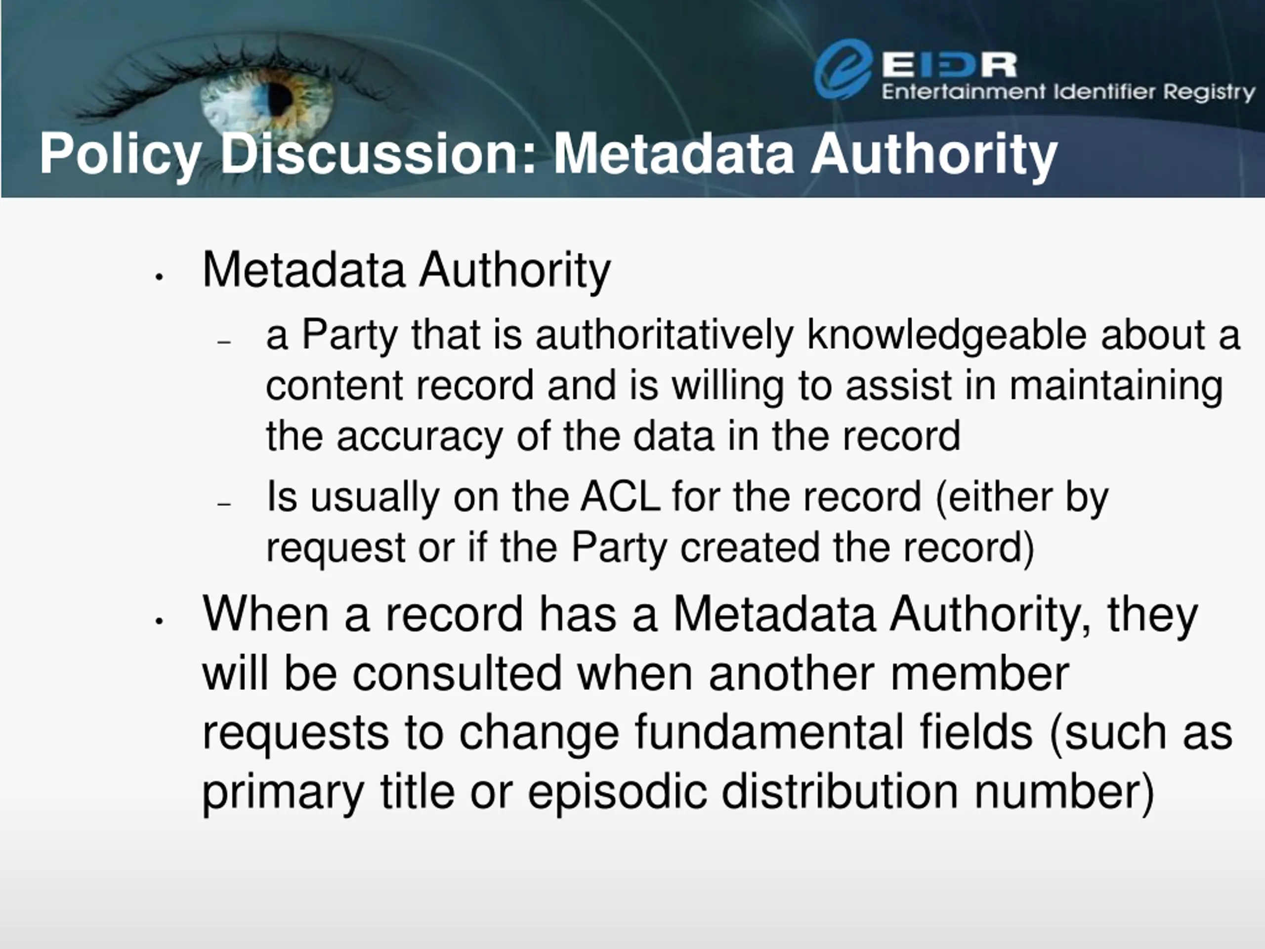 Policy Discussion: Metadata Authority Metadata Authority a Party that is authoritatively knowledgeable about a content record and is willing to assist in maintaining the accuracy of the data in the record Is usually on the ACL for the record (either by request or if the Party created the record) When a record has a Metadata Authority, they will be consulted when another member requests to change fundamental fields (such as primary title or episodic distribution number)