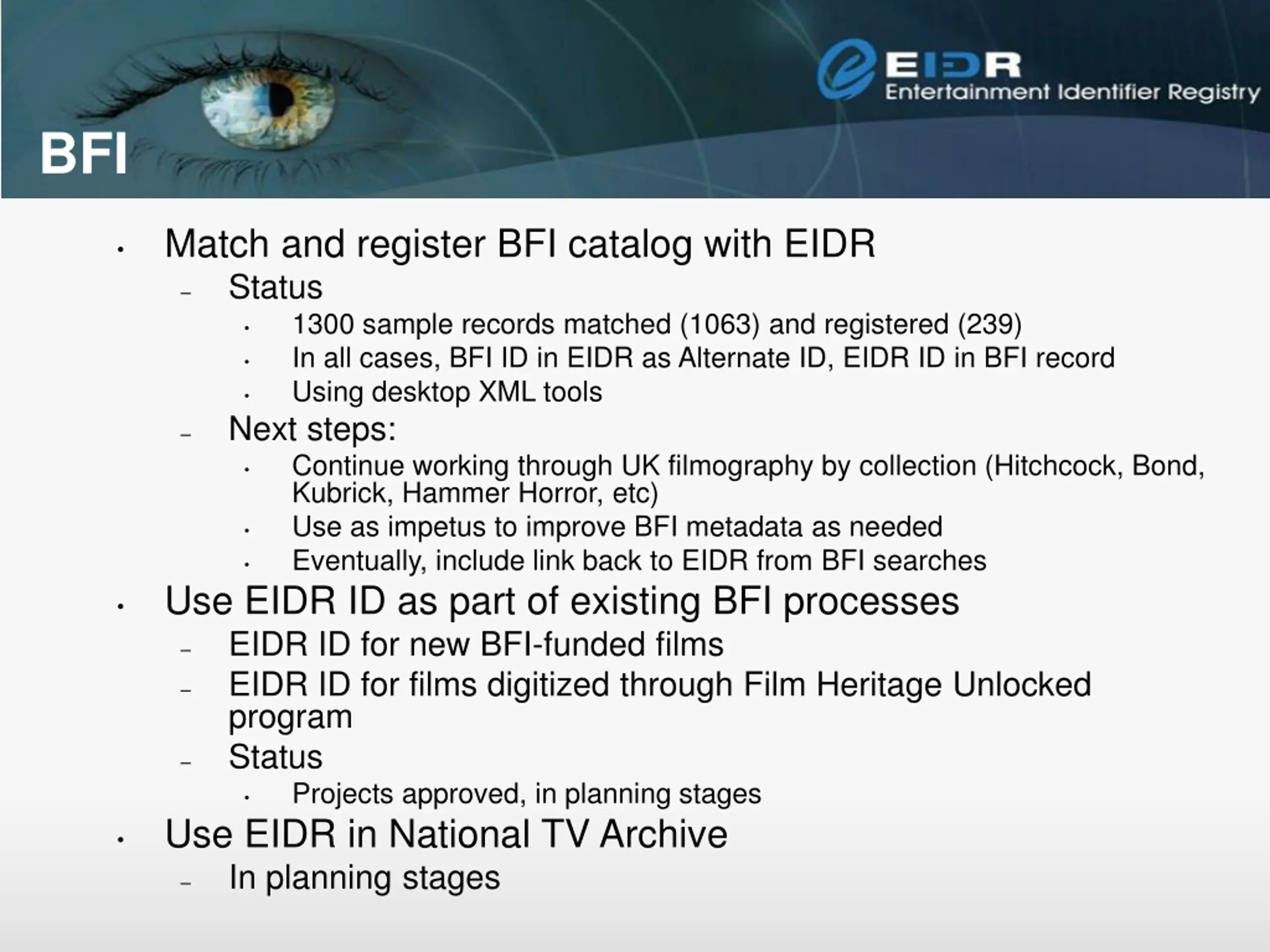 BFI Match and register BFI catalog with EIDR Status 1300 sample records matched (1063) and registered (239) In all cases, BFI ID in EIDR as Alternate ID, EIDR ID in BFI record Using desktop XML tools Next steps: Continue working through UK filmography by collection (Hitchcock, Bond, Kubrick, Hammer Horror, etc) Use as impetus to improve BFI metadata as needed Eventually, include link back to EIDR from BFI searches Use EIDR ID as part of existing BFI processes EIDR ID for new BFI-funded films EIDR ID for films digitized through Film Heritage Unlocked program Status Projects approved, in planning stages Use EIDR in National TV Archive In planning stages