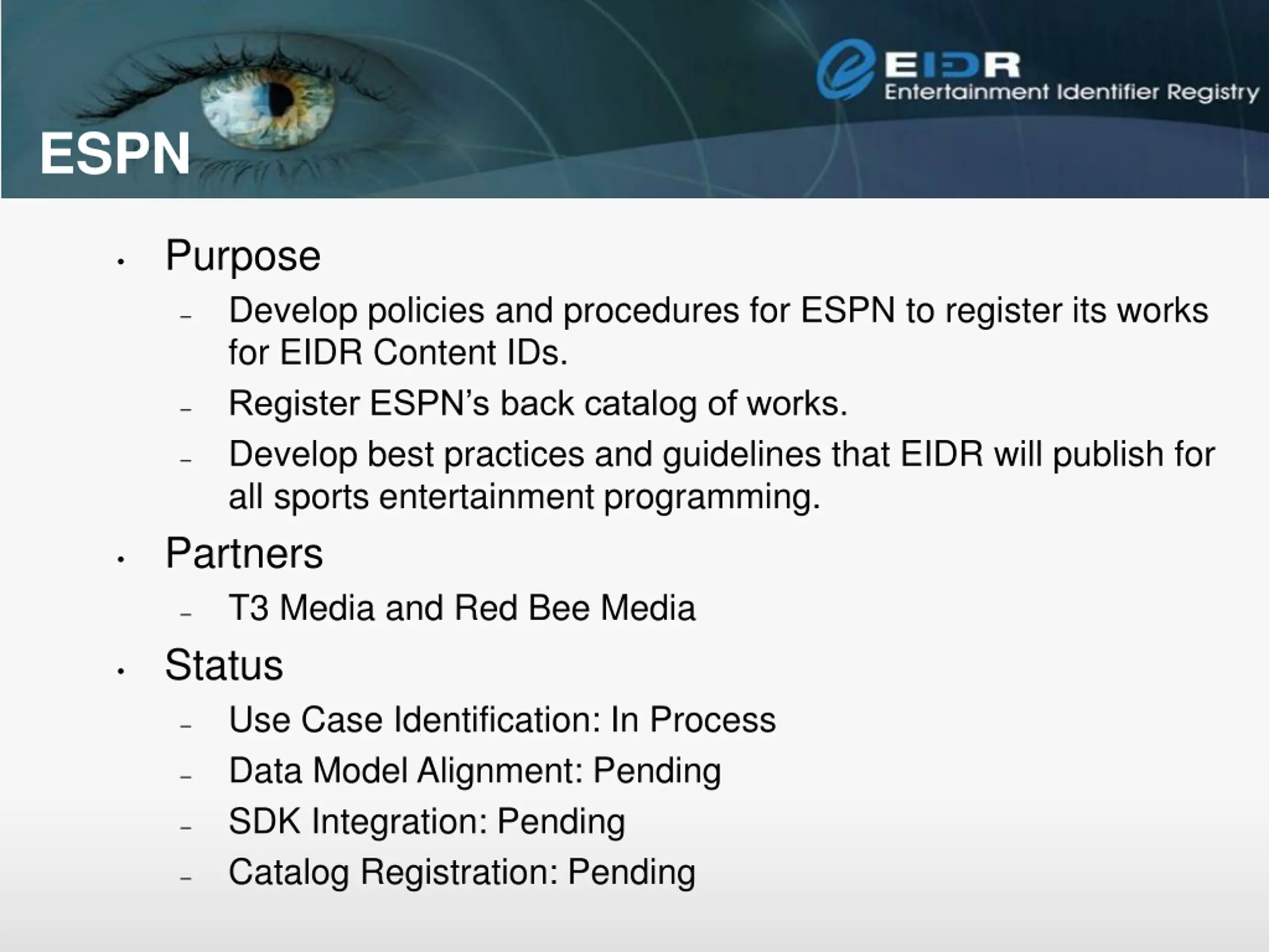 ESPN Purpose Develop policies and procedures for ESPN to register its works for EIDR Content IDs. Register ESPN s back catalog of works. Develop best practices and guidelines that EIDR will publish for all sports entertainment programming. Partners T3 Media and Red Bee Media Status Use Case Identification: In Process Data Model Alignment: Pending SDK Integration: Pending Catalog Registration: Pending