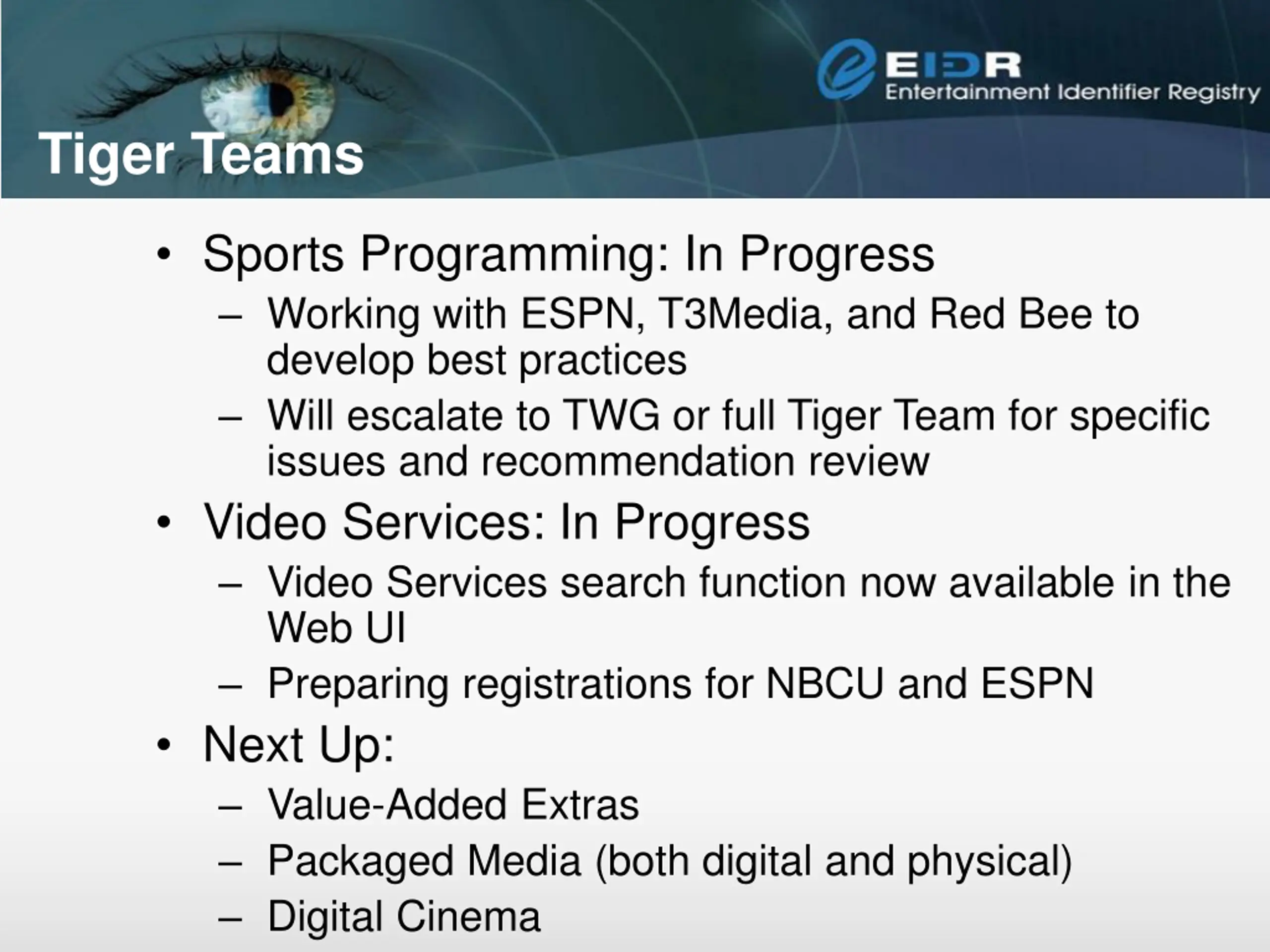 Tiger Teams Sports Programming: In Progress Working with ESPN, T3Media, and Red Bee to develop best practices Will escalate to TWG or full Tiger Team for specific issues and recommendation review Video Services: In Progress Video Services search function now available in the Web UI Preparing registrations for NBCU and ESPN Next Up: Value-Added Extras Packaged Media (both digital and physical) Digital Cinema
