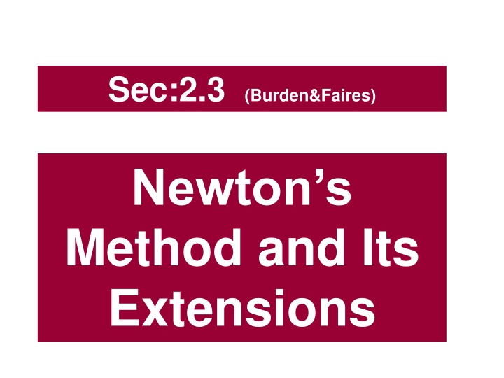 Sec:2.3 Newtons Method and Its Extensions The Secant Method Newton s method is an extremely powerful technique, but it has a major weakness: the need to know the value of the derivative of f at each approximation. Frequently, f(x) is far more difficult and needs more arithmetic operations to calculate than f (x). Newton method The Secant Method ??+1= ?? ?(??) ??= ?? 1 ?(?? 1)(?? 1 ?? 2) ? ?? 1 ?(?? 2) ? (??) Backward difference ? ?? ?(?? 1) ?? ?? 1 We need to Start with two initial approximations ??and ??. Note that only one function evaluation is needed per step for the Secant method after ??has been determined. In contrast, each step of Newton s method requires an evaluation of both the function and its derivative. ? ?? The Secant Method ??+1= ?? ?(??)(?? ?? 1) ? ?? ?(?? 1)