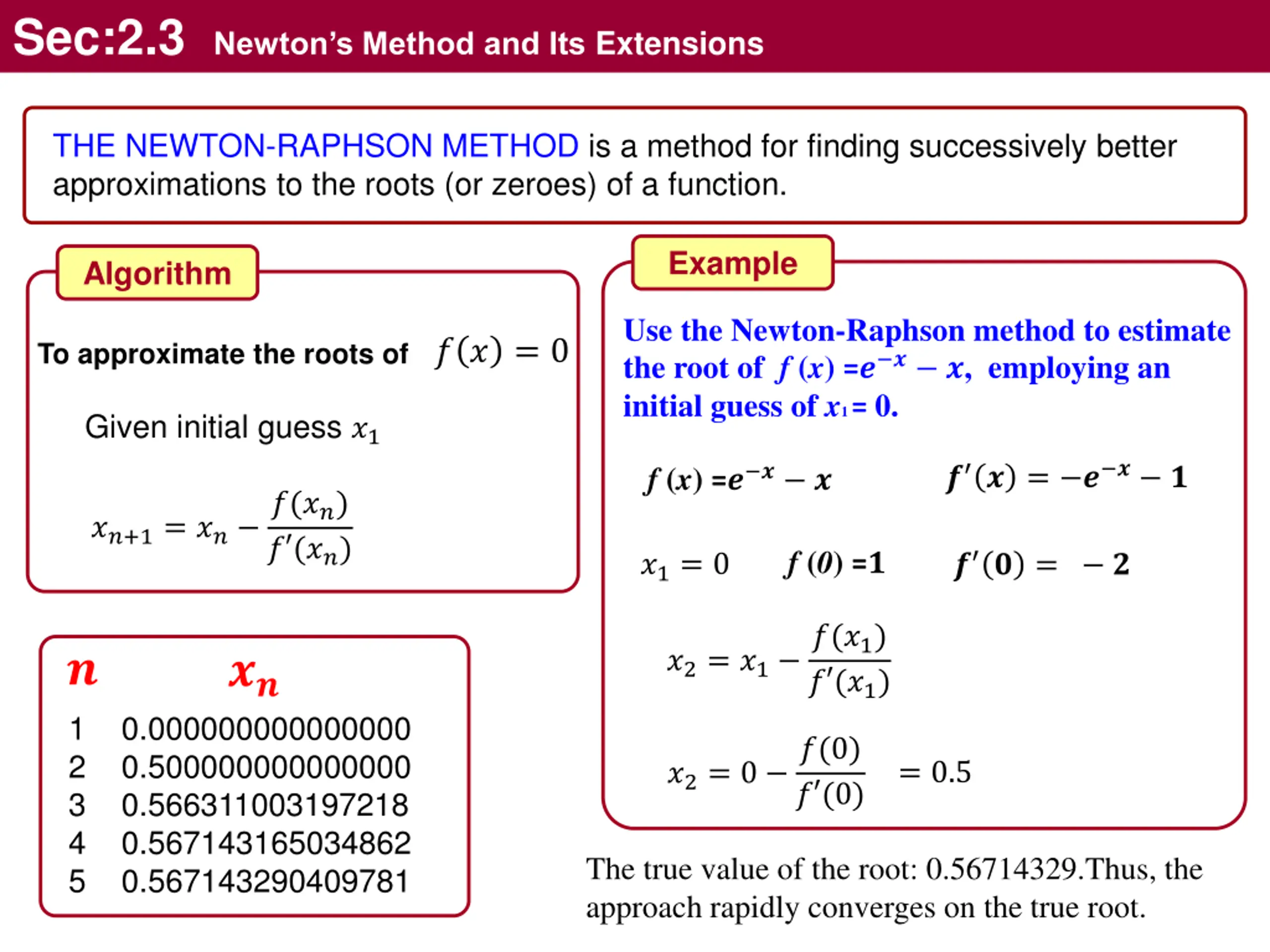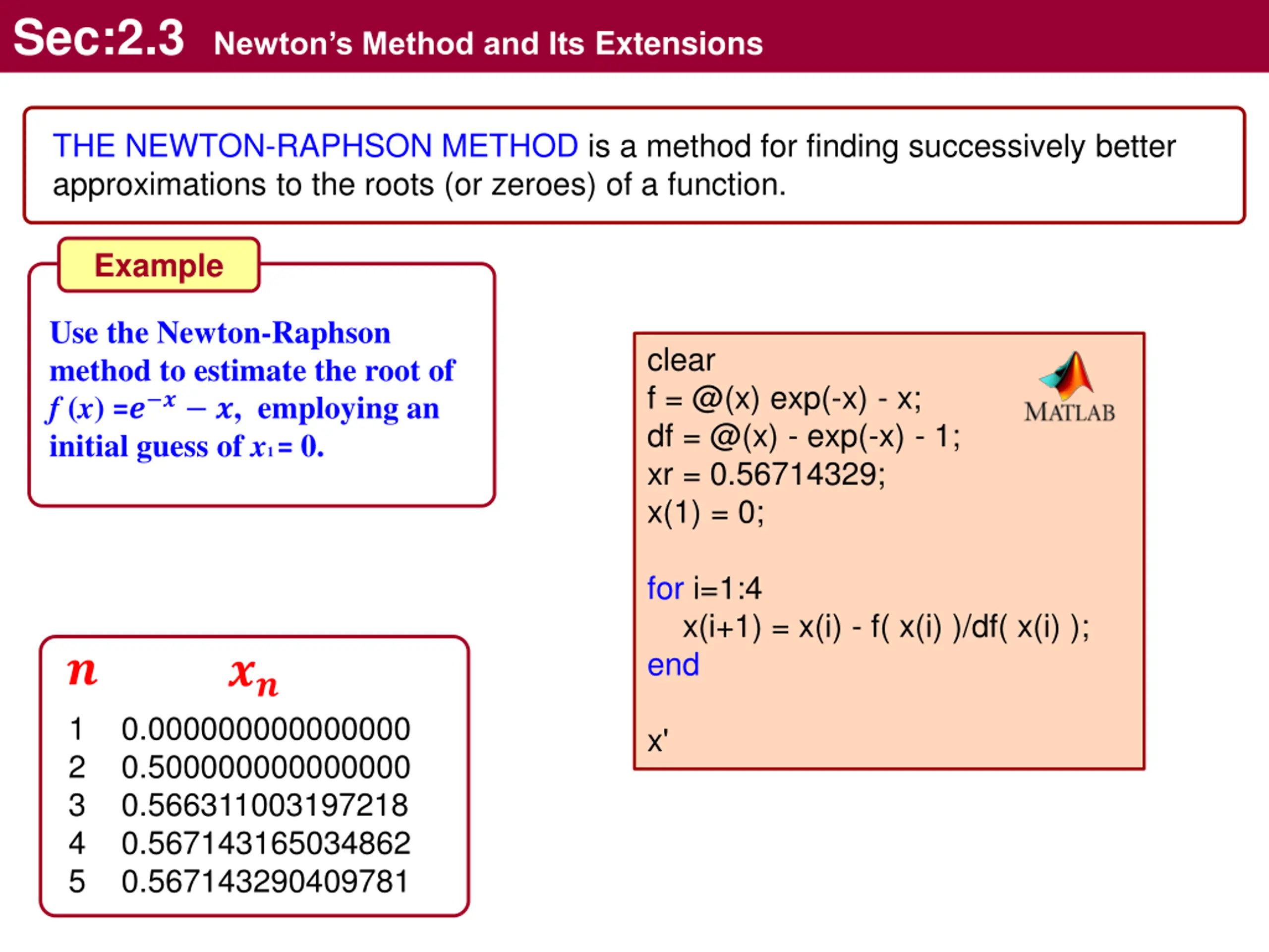 Sec:2.3 Newtons Method and Its Extensions THE NEWTON-RAPHSON METHOD is a method for finding successively better approximations to the roots (or zeroes) of a function. Example Use the Newton-Raphson method to estimate the root of f (x) =? ? ?, employing an initial guess of x1 = 0. clear f = @(x) exp(-x) - x; df = @(x) - exp(-x) - 1; xr = 0.56714329; x(1) = 0; for i=1:4 x(i+1) = x(i) - f( x(i) )/df( x(i) ); end ? ?? 1 0.000000000000000 2 0.500000000000000 3 0.566311003197218 4 0.567143165034862 5 0.567143290409781 x'
