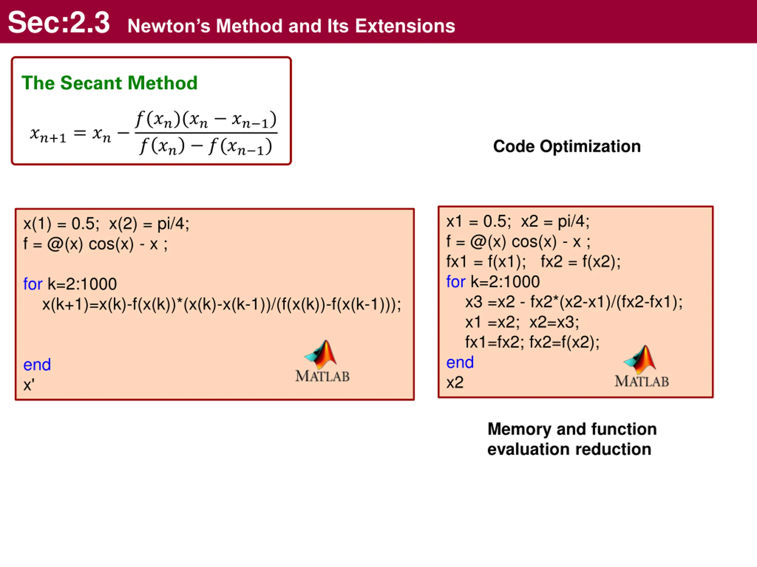 Sec:2.3 Newtons Method and Its Extensions The Secant Method ??+1= ?? ?(??)(?? ?? 1) ? ?? ?(?? 1) Code Optimization x1 = 0.5; x2 = pi/4; f = @(x) cos(x) - x ; fx1 = f(x1); fx2 = f(x2); for k=2:1000 x3 =x2 - fx2*(x2-x1)/(fx2-fx1); x1 =x2; x2=x3; fx1=fx2; fx2=f(x2); end x2 x(1) = 0.5; x(2) = pi/4; f = @(x) cos(x) - x ; for k=2:1000 x(k+1)=x(k)-f(x(k))*(x(k)-x(k-1))/(f(x(k))-f(x(k-1))); end x' Memory and function evaluation reduction