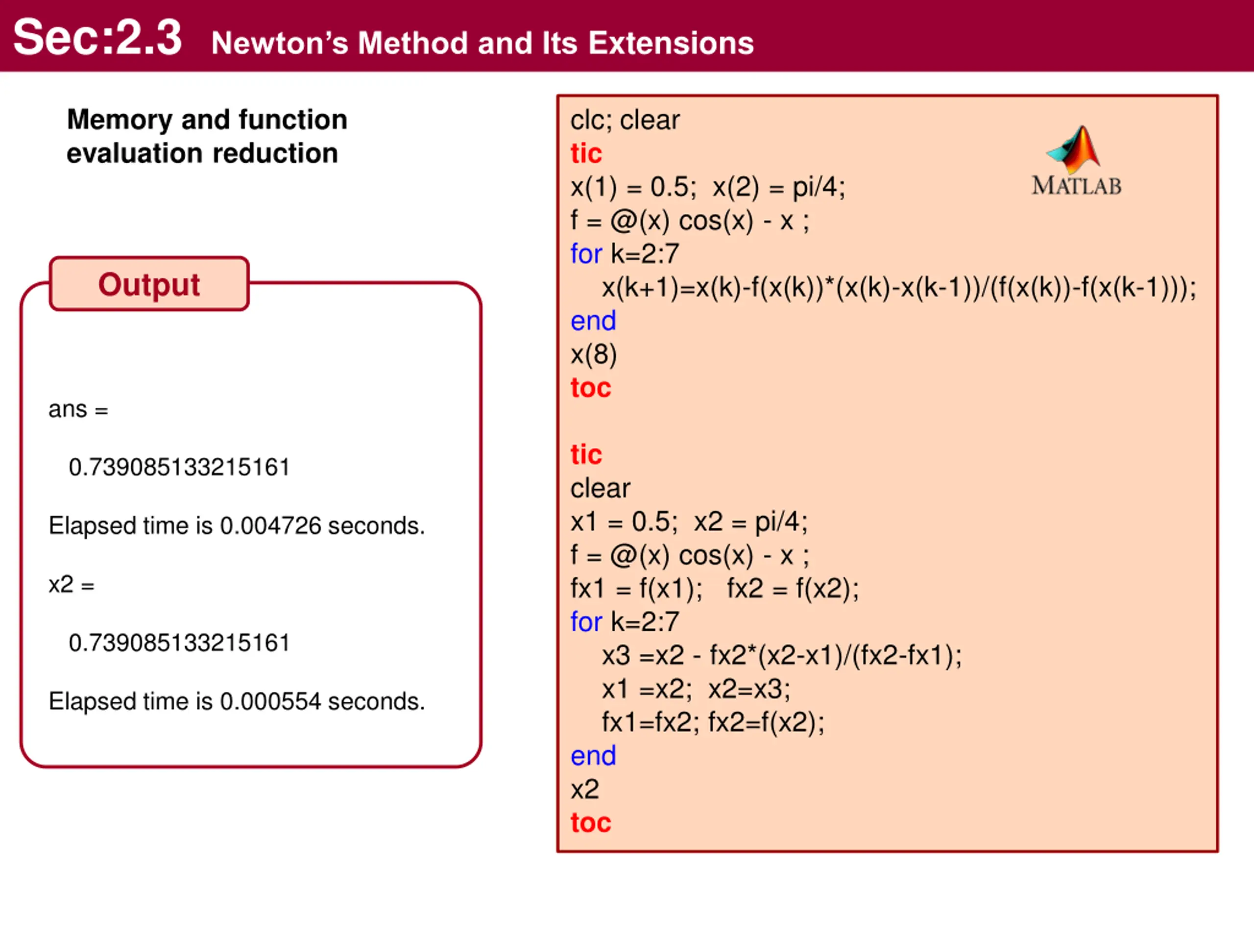Sec:2.3 Newtons Method and Its Extensions clc; clear tic x(1) = 0.5; x(2) = pi/4; f = @(x) cos(x) - x ; for k=2:7 x(k+1)=x(k)-f(x(k))*(x(k)-x(k-1))/(f(x(k))-f(x(k-1))); end x(8) toc Memory and function evaluation reduction Output ans = tic clear x1 = 0.5; x2 = pi/4; f = @(x) cos(x) - x ; fx1 = f(x1); fx2 = f(x2); for k=2:7 x3 =x2 - fx2*(x2-x1)/(fx2-fx1); x1 =x2; x2=x3; fx1=fx2; fx2=f(x2); end x2 toc 0.739085133215161 Elapsed time is 0.004726 seconds. x2 = 0.739085133215161 Elapsed time is 0.000554 seconds.