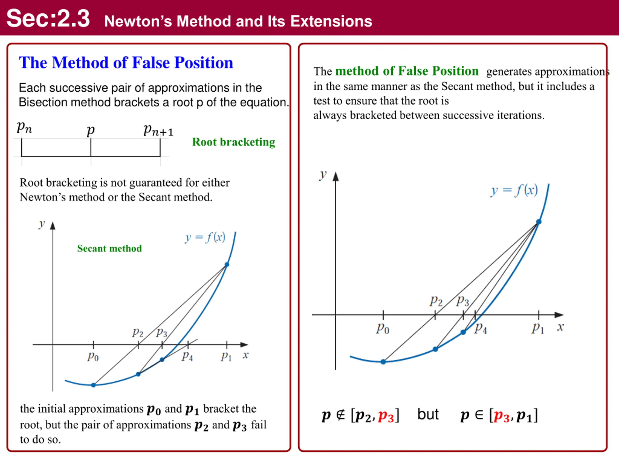 Sec:2.3 Newtons Method and Its Extensions The Method of False Position The method of False Position generates approximations in the same manner as the Secant method, but it includes a test to ensure that the root is always bracketed between successive iterations. Each successive pair of approximations in the Bisection method brackets a root p of the equation. ?? ??+1 ? Root bracketing Root bracketing is not guaranteed for either Newton s method or the Secant method. Secant method the initial approximations ??and ??bracket the root, but the pair of approximations ??and ??fail to do so. but ? [??,??] ? [??,??]