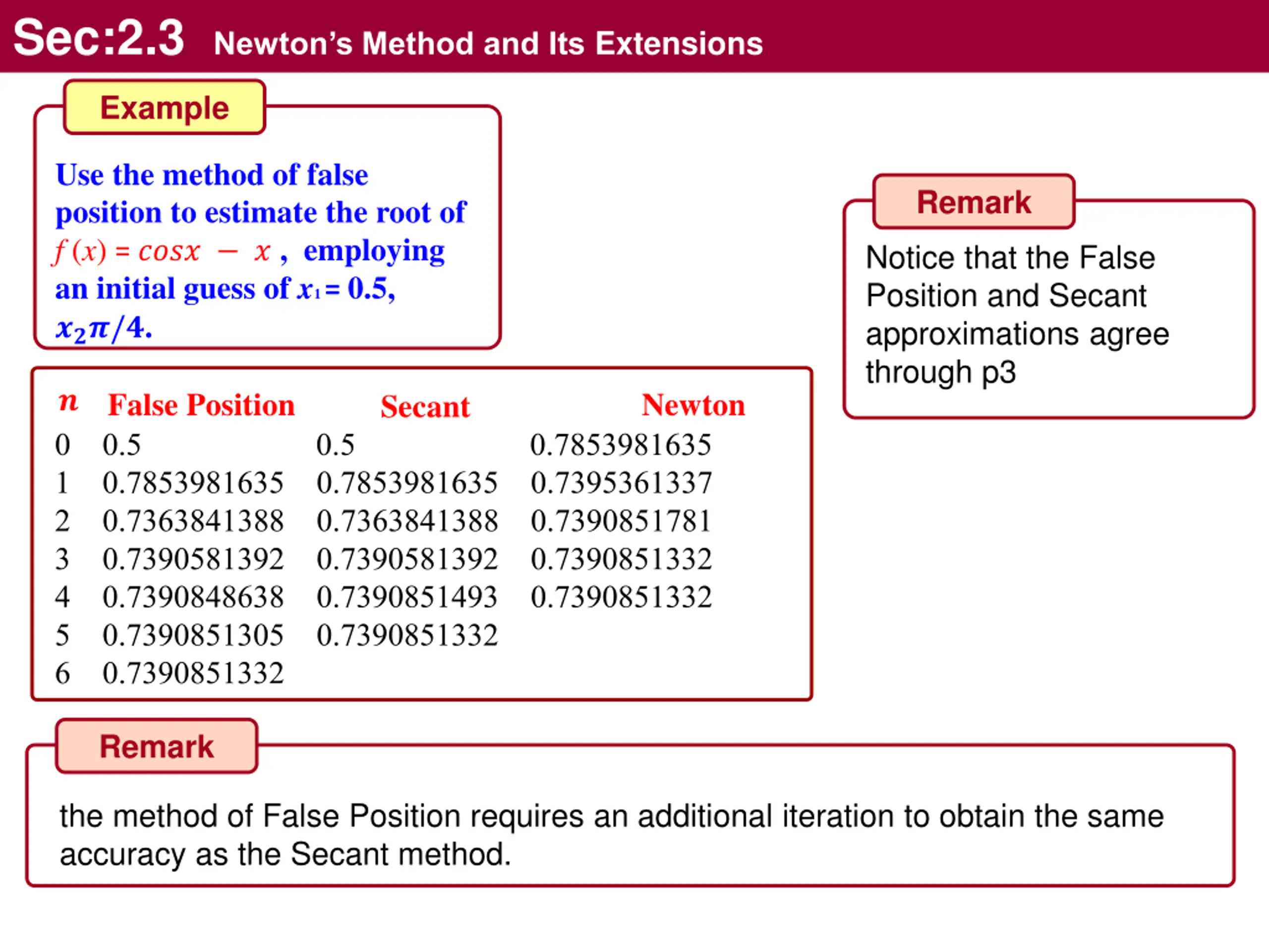 Sec:2.3 Newtons Method and Its Extensions Example Use the method of false position to estimate the root of f (x) = ???? ? , employing an initial guess of x1 = 0.5, ???/?. Remark Notice that the False Position and Secant approximations agree through p3 False Position Newton ? Secant 0 0.5 0.5 0.7853981635 1 0.7853981635 0.7853981635 0.7395361337 2 0.7363841388 0.7363841388 0.7390851781 3 0.7390581392 0.7390581392 0.7390851332 4 0.7390848638 0.7390851493 0.7390851332 5 0.7390851305 0.7390851332 6 0.7390851332 Remark the method of False Position requires an additional iteration to obtain the same accuracy as the Secant method.