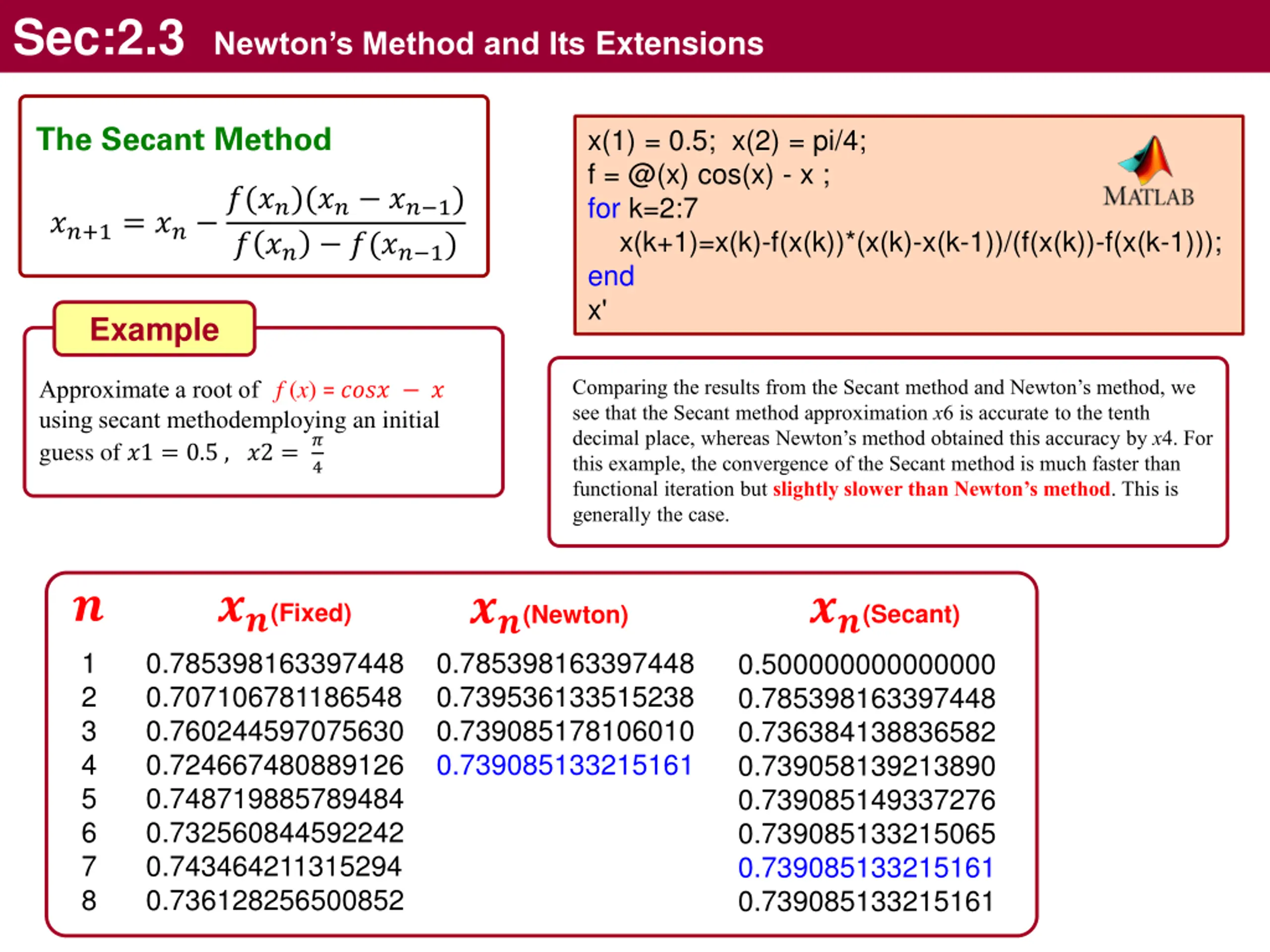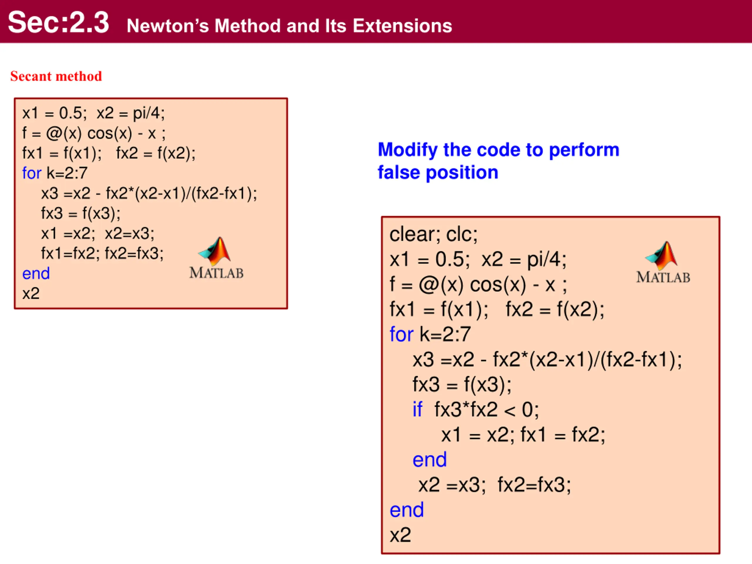 Sec:2.3 Newtons Method and Its Extensions Secant method x1 = 0.5; x2 = pi/4; f = @(x) cos(x) - x ; fx1 = f(x1); fx2 = f(x2); for k=2:7 x3 =x2 - fx2*(x2-x1)/(fx2-fx1); fx3 = f(x3); x1 =x2; x2=x3; fx1=fx2; fx2=fx3; end x2 Modify the code to perform false position clear; clc; x1 = 0.5; x2 = pi/4; f = @(x) cos(x) - x ; fx1 = f(x1); fx2 = f(x2); for k=2:7 x3 =x2 - fx2*(x2-x1)/(fx2-fx1); fx3 = f(x3); if fx3*fx2 < 0; x1 = x2; fx1 = fx2; end x2 =x3; fx2=fx3; end x2